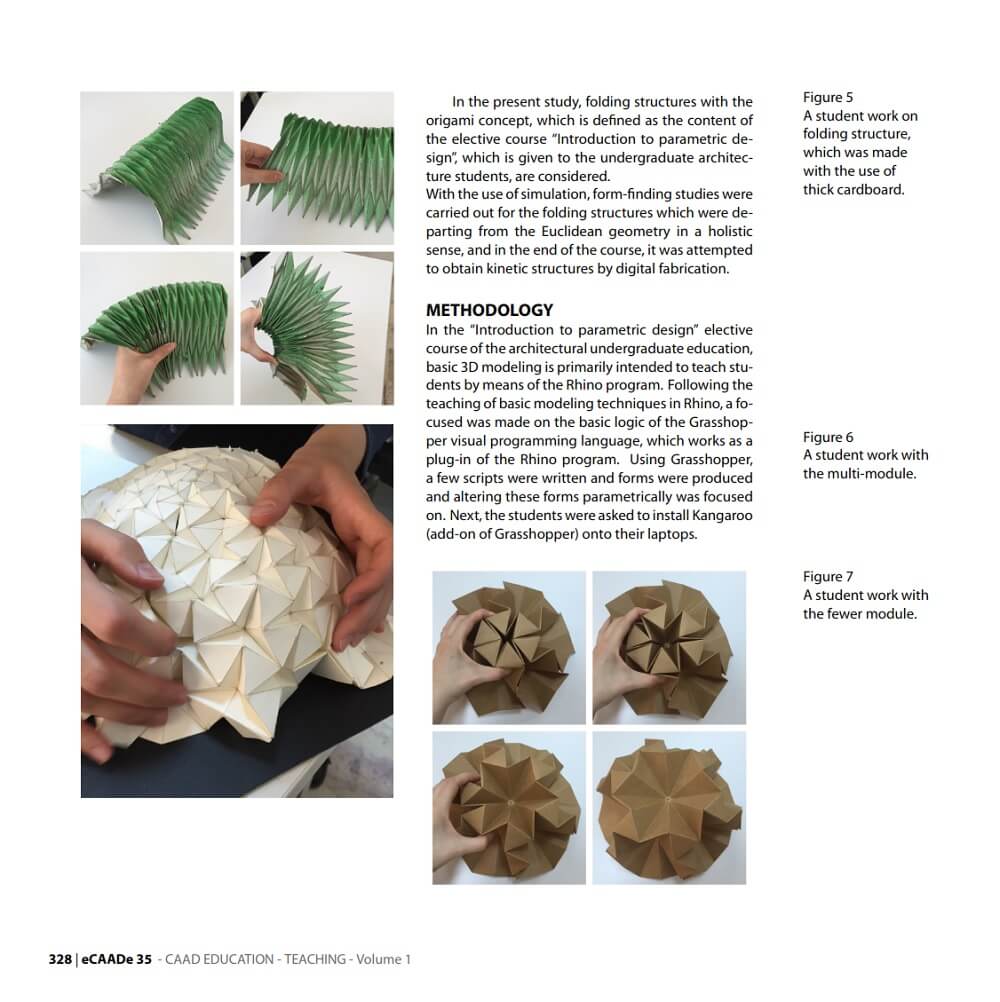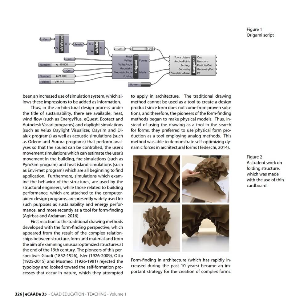 In this particular course presented by Asli Agirbas, it was intended that all stages should be experienced, from the modeling in the virtual environment to the digital fabrication. Hence, in their early years of architectural education, the students were able to learn versatile thinking by experiencing, simultaneously, the use of simulation in the environment of visual programming language, the forming space by using folding structures, the material-based thinking and the creation of their designs suitable to the digital fabrication.