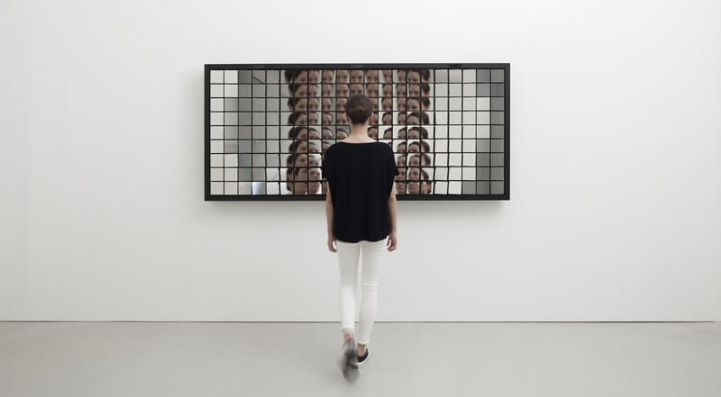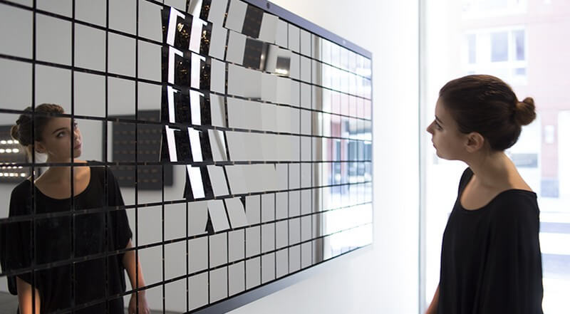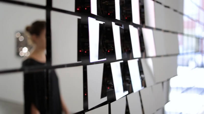 Fragments is an interactive installation by Random International. Almost two hundred identical, small mirrors are arranged in a grid to form a flat, homogenous surface. Hung against the wall, the mirrors are closely spaced and apparently static; but they possess the ability to move in harmony with one another.