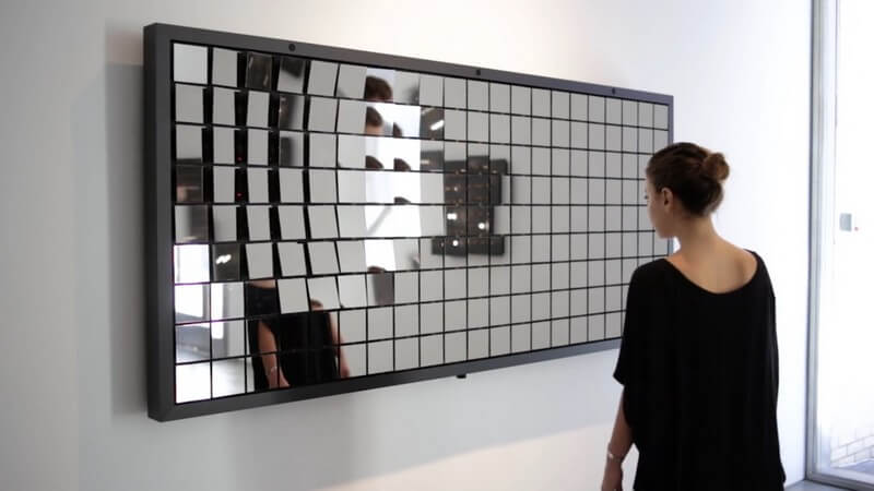 Approaching the artwork, the individual mirrors turn together to face the onlooker, following as he or she moves. The plane of the surface distorts into varying, three-dimensional forms — perhaps a wave, or a curve, or a circle.