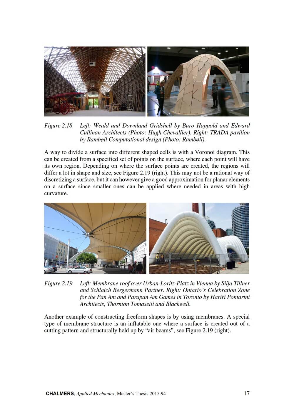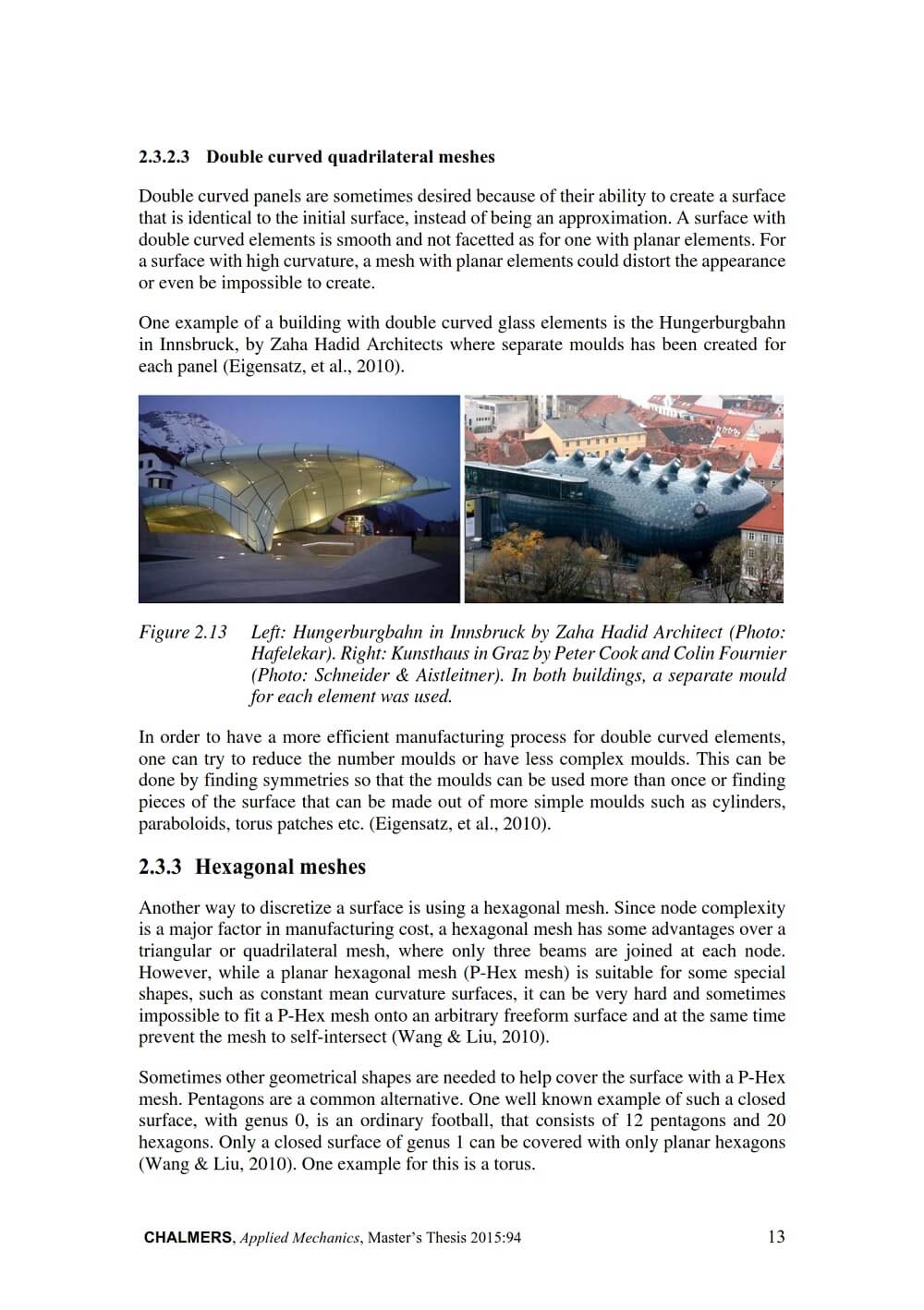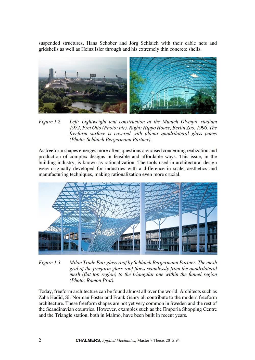 In this study by Viktoria Henriksson and Maria Hult, rationalization in terms of different surface discretization methods has been a main focus. Geometrical theory of how to divide a surface into smaller elements have been studied for historical and modern buildings in order to understand what important factors exist. Site visits and interviews with practicing architects and engineers have been conducted in order to study different design approaches and rationalization of real projects.