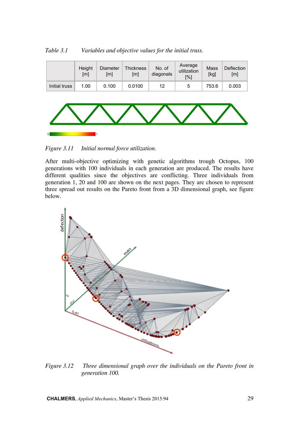 Rhinoceros, plugin Grasshopper, and structurally analysed with the FE add-on Karamba. Different possible solutions were investigated by the use of genetic algorithm optimization in the Grasshopper, add-on Octopus. The solutions are compared to each other in order to find an optimal solution regarding load bearing capacity, cost and architectural qualities.