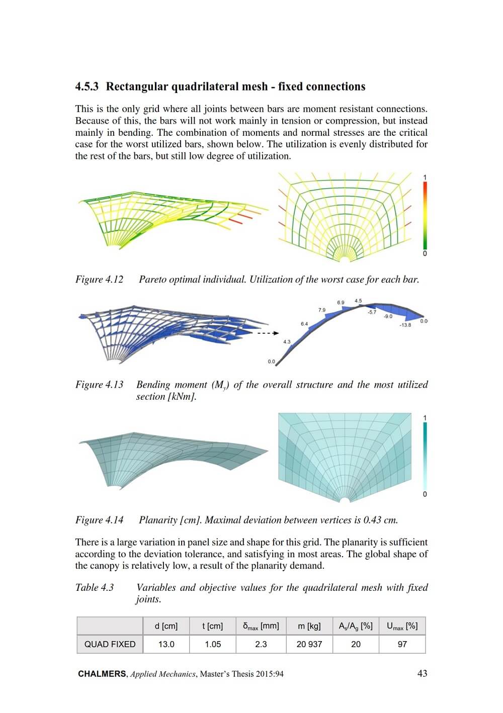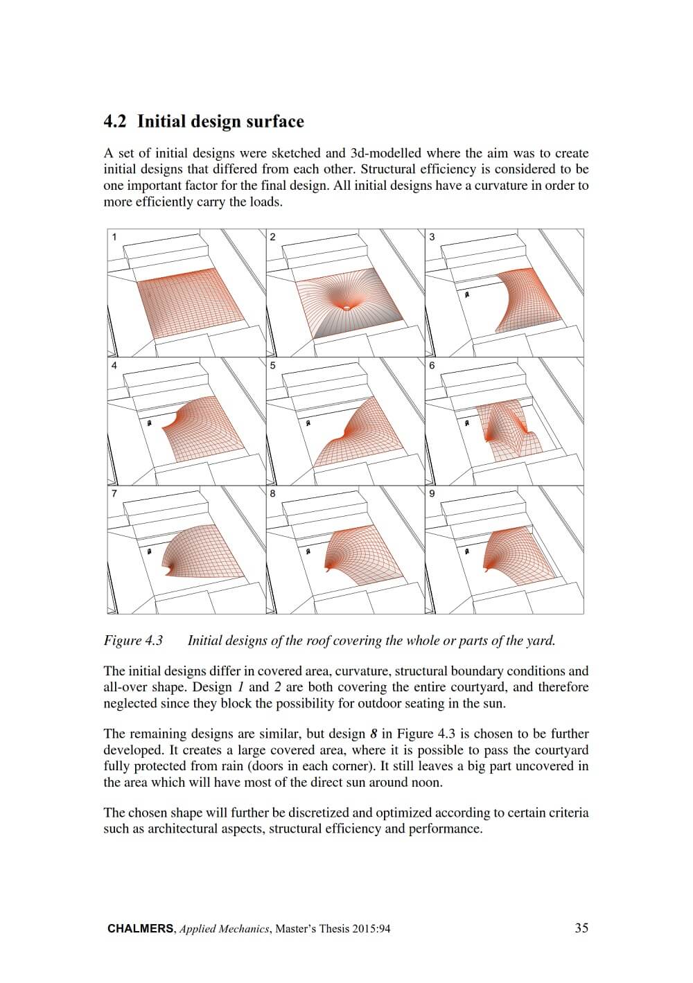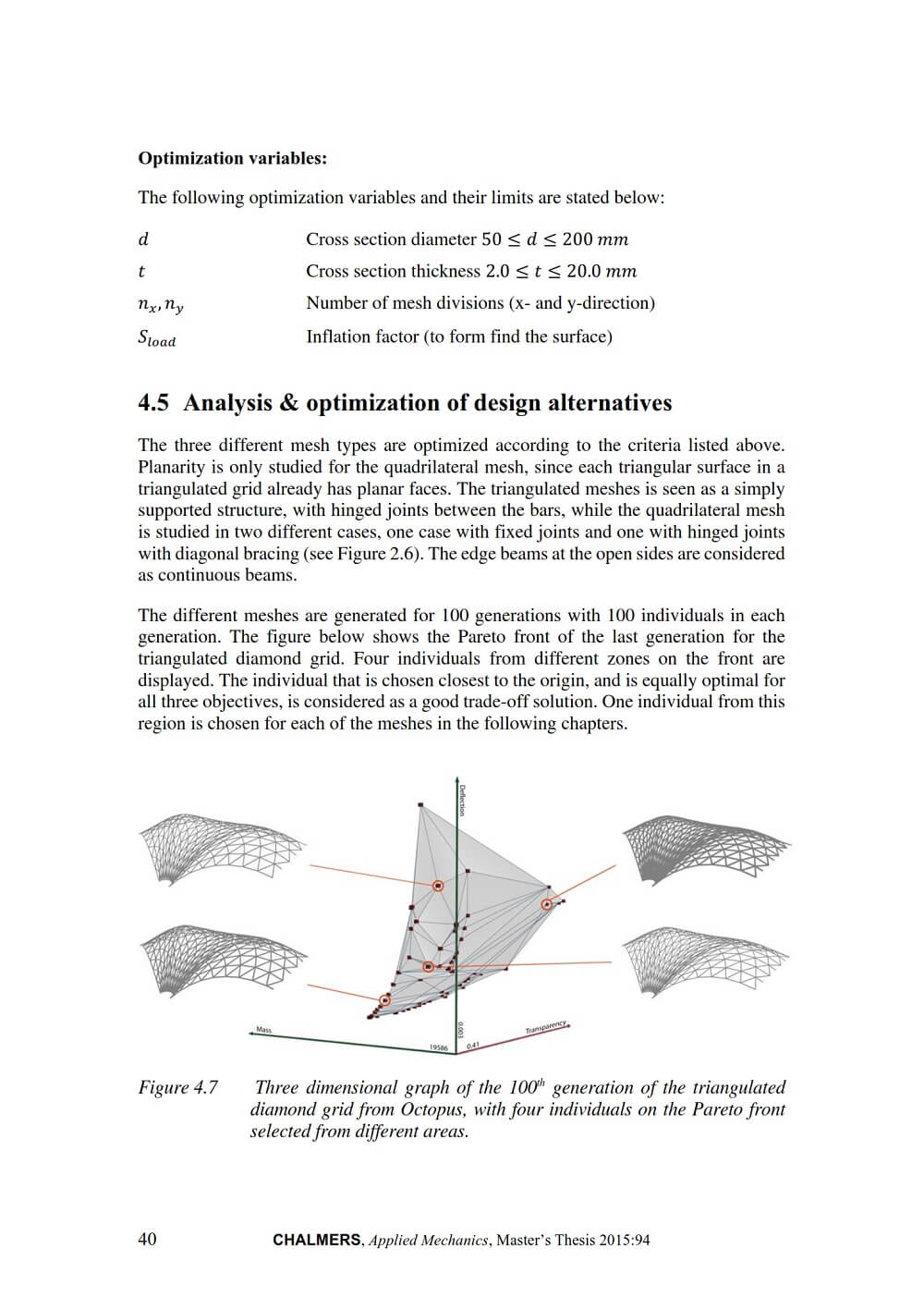 The design project shows that the studied discretization methods have different advantages and drawbacks depending on the specific case. It also shows that the use of genetic algorithms and parametric design can be very effective for generating many different solutions to complex problems. However, the role of the designer is still very important when it comes to judging the result and selecting a design based on qualitative objectives.