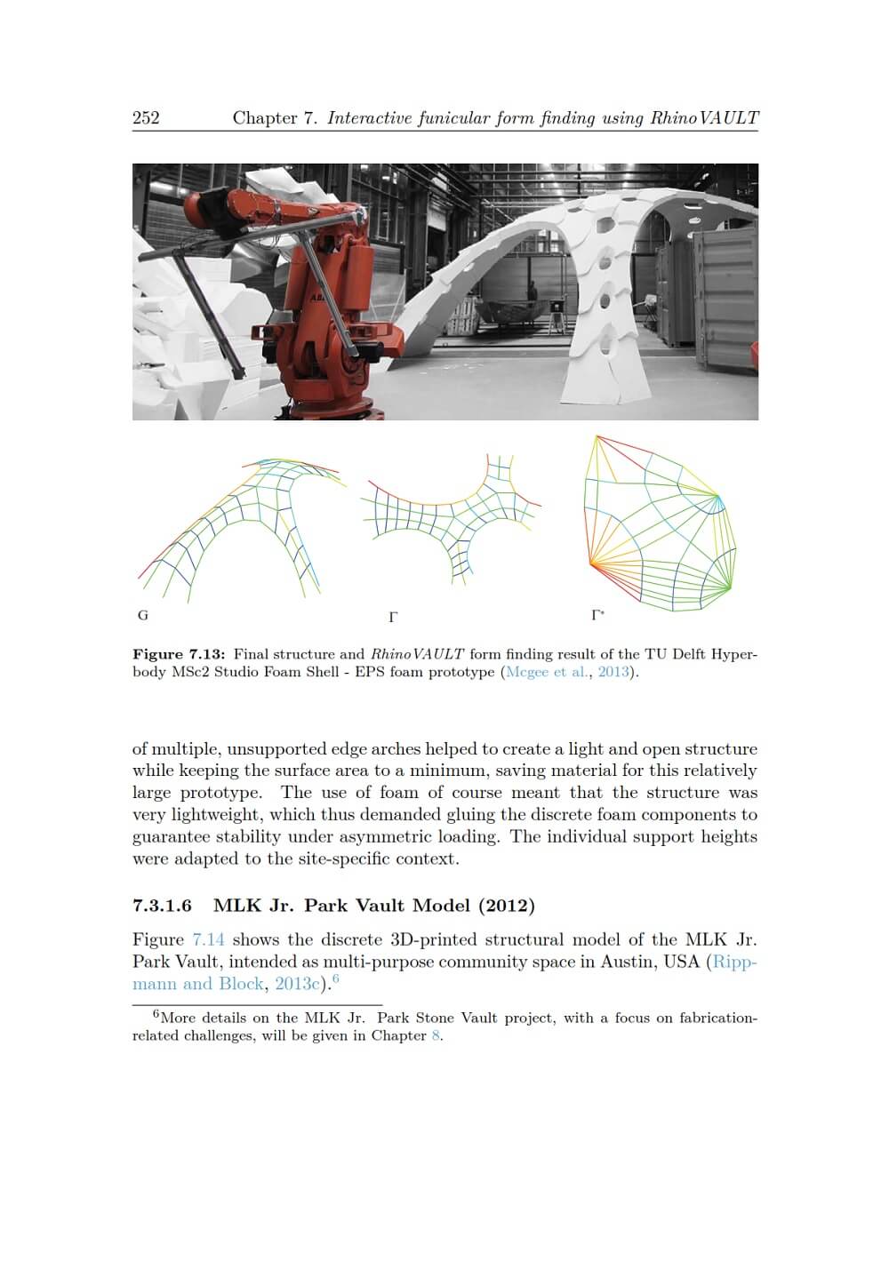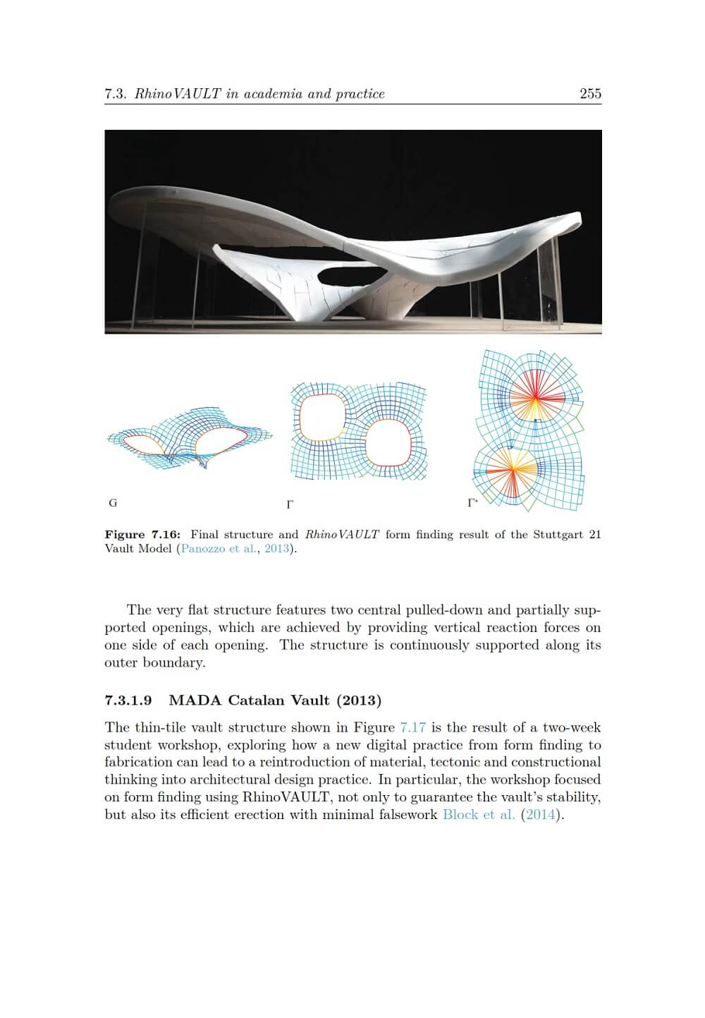 The flexibility and feasibility of the form-finding framework is demonstrated in several case studies employing the new structural design tool RhinoVAULT, which implements the developed form-finding methods. The use of fabrication design strategies is discussed in a comprehensive case study that shows project-specific tessellation design variations and first fabrication results for a complex stone masonry shell.
