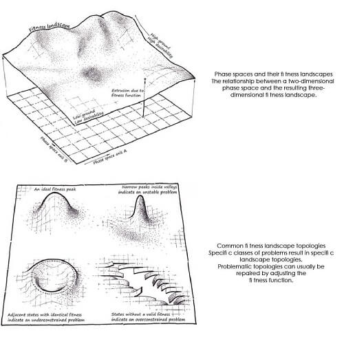 I would like to explain two very different generic solver classes, both of which I implemented in the Galapagos plug-in for Grasshopper®. This will necessarily be a very brief explanation that cuts many corners, but the basic idea behind each solver is not very complicated. Both are based on real-life processes: one physical, one biological.