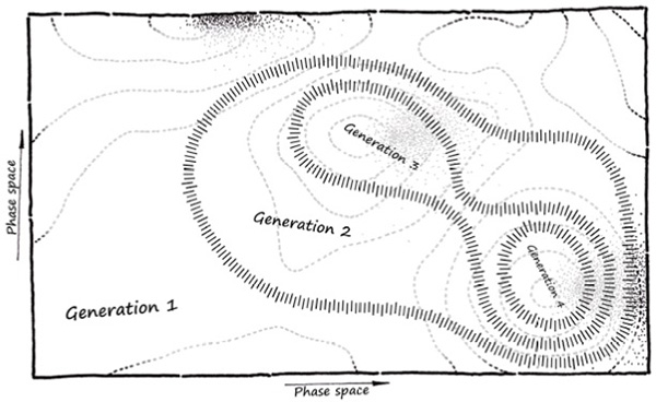 Evolutionary algorithms apply the biological principles of mutation, selection and inheritance. They will populate the landscape with virtual individuals and then proceed to breed the highest ones in the hope that their offspring will be closer to a summit. Much decision-making is involved here regarding mate selection and various stochastic processes, but these are mere details.