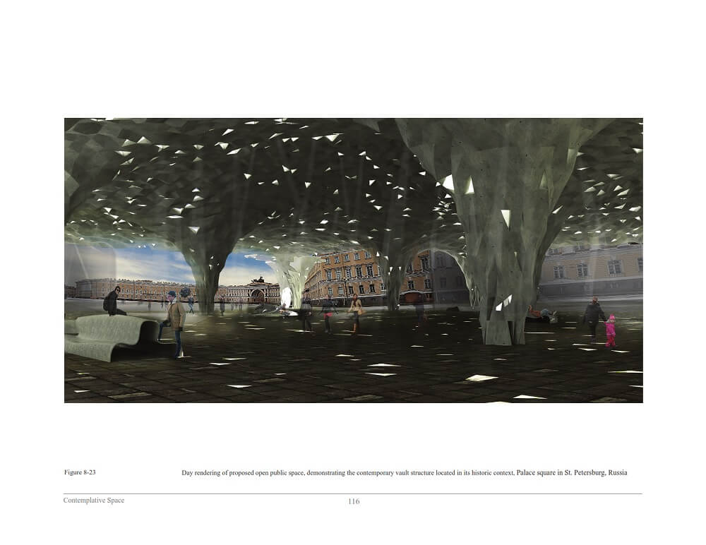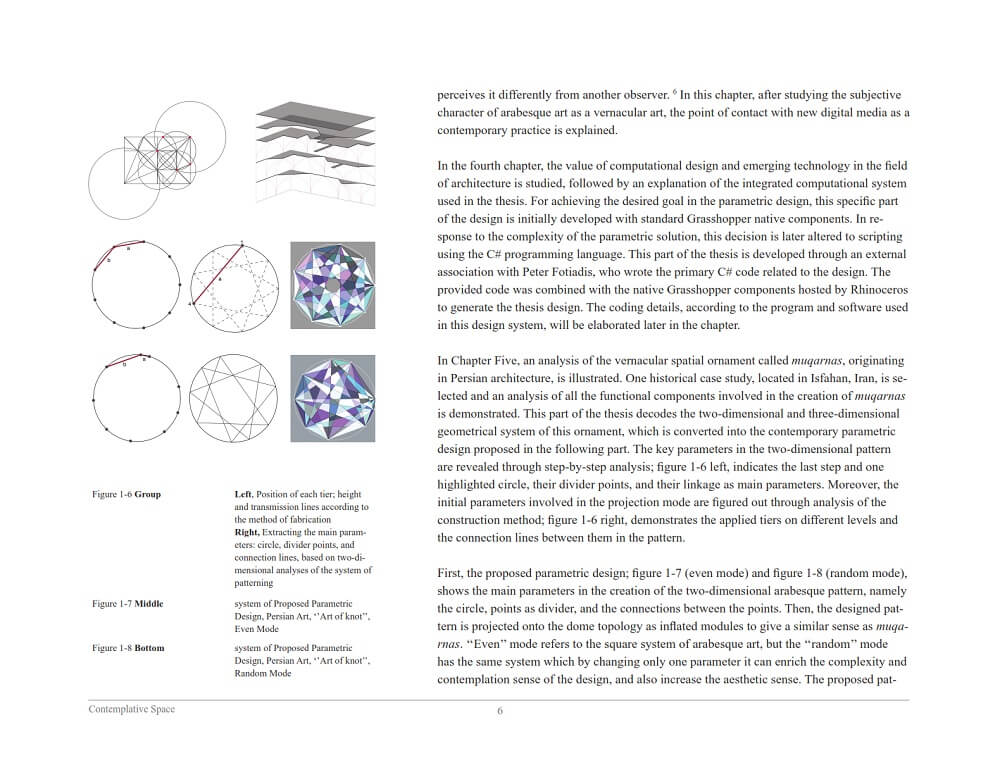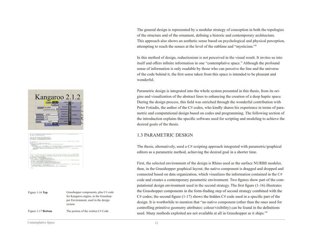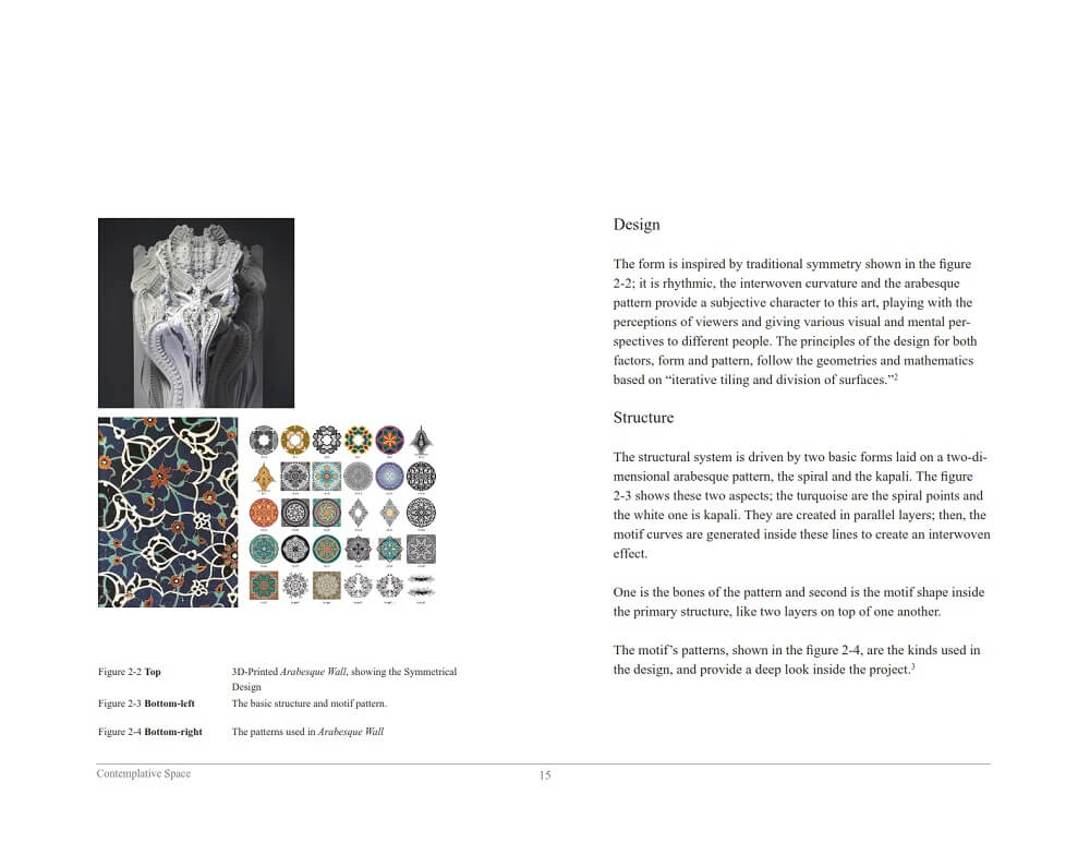 Research informing this design focuses on historical and contemporary architecture. Con- temporary precedents, “Arabesque Wall,” by Benjamin Dillenburger and Michael Hans Meyer, and “La Voûte de LeFevre” by Brandon Clifford and Wes McGee are described. An analysis of these precedents explores how emerging digital technologies informed by history, can create a new design ecology and culture. Additional discussion considers cultural and phenomenological observations and aesthetics of the design in its physical and psychological aspects, considered in contexts that range from topology of the form to visual perception of the internal “contemplative space.”
