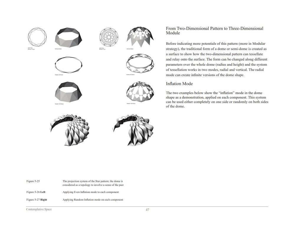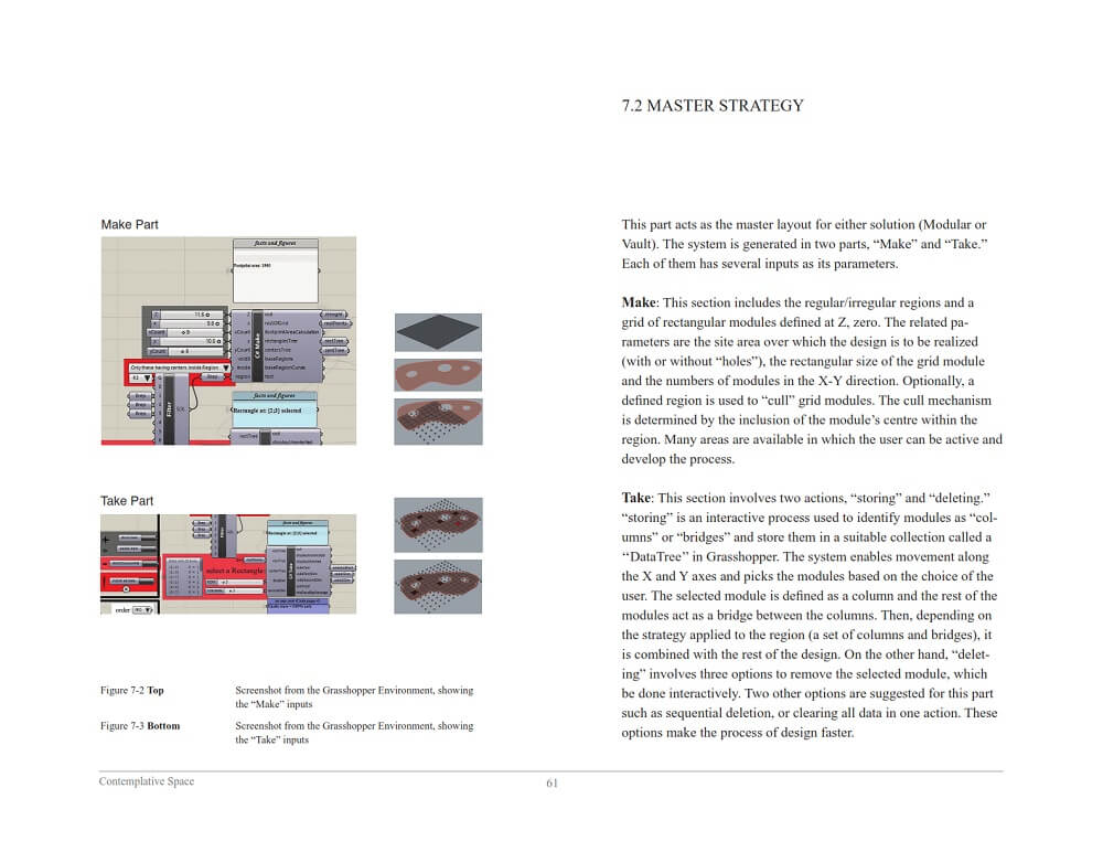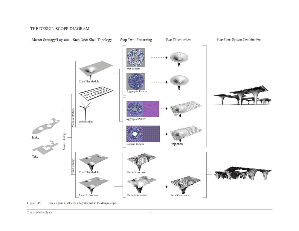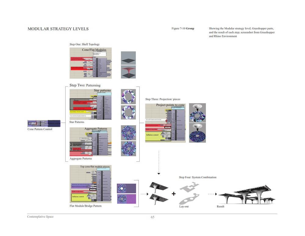 By abstracting muqarnas, and exploring aniconic character informed by both vernacular precedent and contemporary parametric design methods, the design offers a specialized new interpretation of this historical type of ornament. The design proposes an expandable master system. Two strategies based on this system are illustrated, both organized with similar components: columns (load-bearing modules) and bridges (modules for covering spans). Different behaviours are exhibited: first, symmetrical and homogeneous form and, second, non-symmetrical and heterogeneous form.