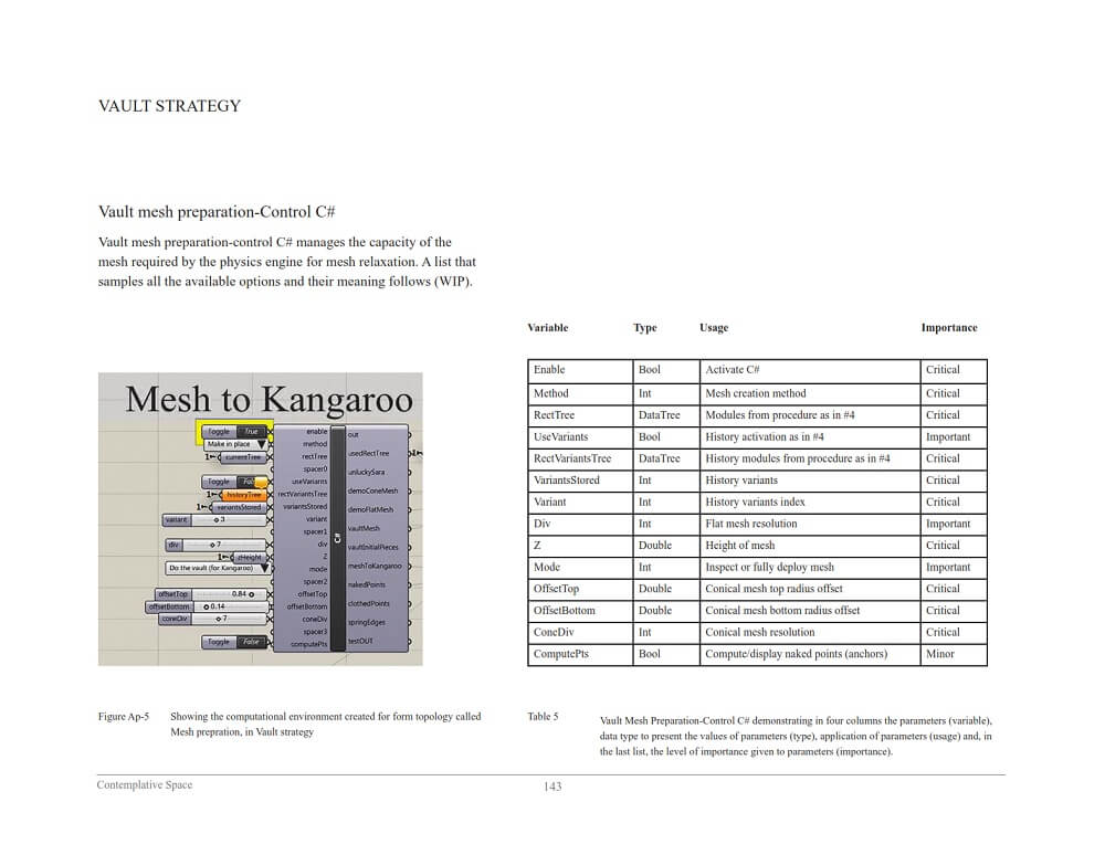 The second layer of this complex system uses the topology of a vault system. A decoration system proposed for articulating interior-oriented surfaces is based on algorithmic geometry. This system offers two different characters, first inspired by muqarnas as a specific vernacular ornament, primarily from traditional Persian architecture, and second as a non-cultural, neutral ornament originating from computational design and achieved by deformation of mesh division. Software tool use is illustrated, demonstrating how scripted Grasshopper software components hosting custom C# code passages are used within a multi-layer design process.
