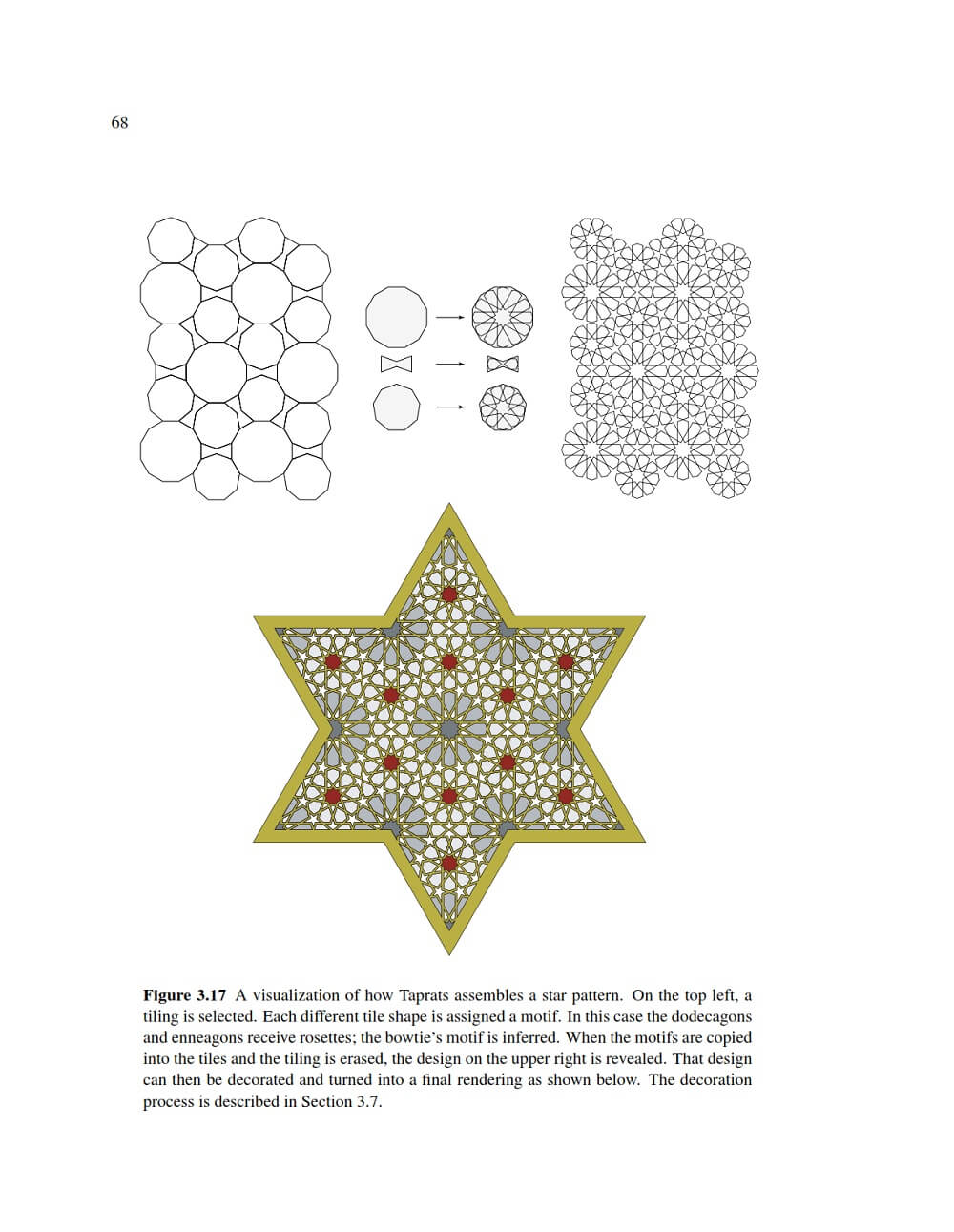 In this dissertation by Craig S. Kaplan, author present his research in the area of computer-generated geometric art and ornament. He focused on two projects in particular. First he developed a collection of tools and methods for producing traditional Islamic star patterns. Then he examined the tesselations of M. C. Escher, developing an “Escherization” algorithm that can derive novel Escher-like tesselations of the plane from arbitrary user-supplied shapes. Throughout, he showed how modern mathematics, algorithms, and technology can be applied to the study of these ornamental styles.