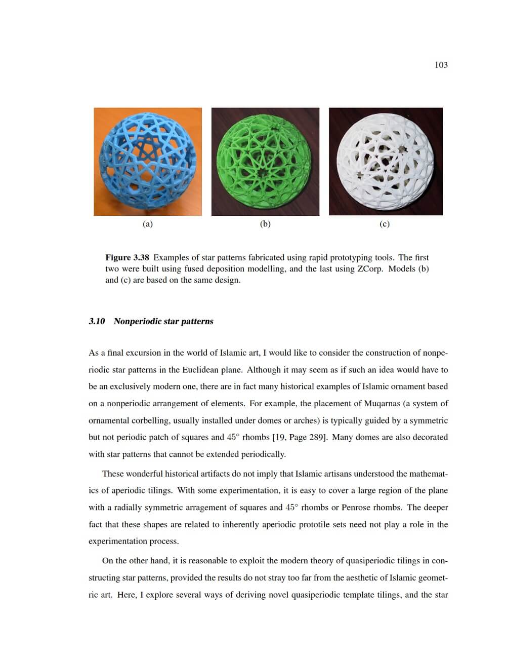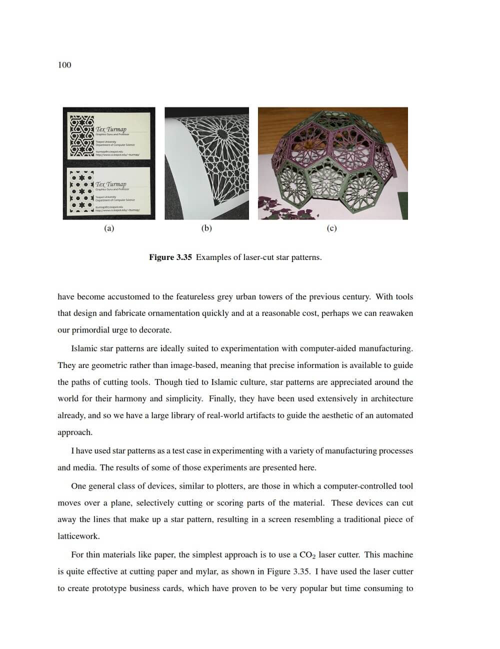 We have new algorithmic tools: computers and the abstract mathematical processing they enable us to perform calculations that were intractable in previous generations. Finally, we have technological tools: manufacturing devices that can turn a synthetic description provided by a computer into a real-world artifact. Taken together, these three sets of tools provide new opportunities for the application of computers to the analysis and creation of ornament.