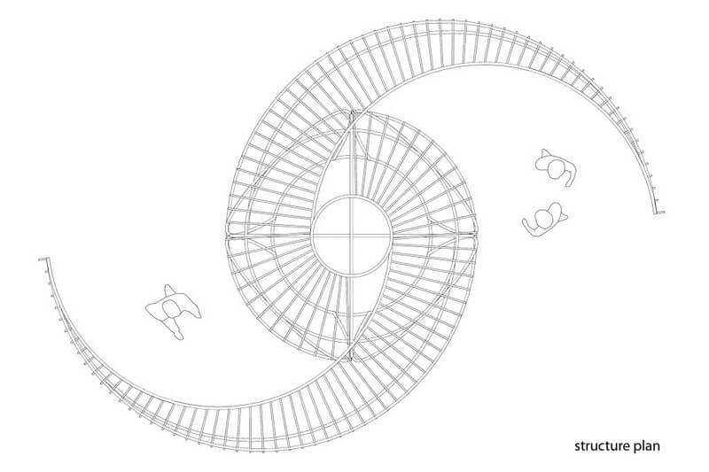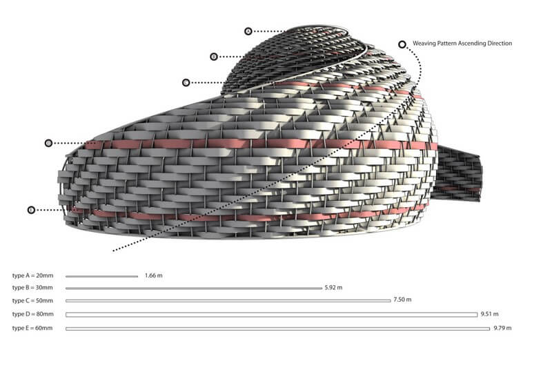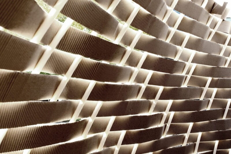 Two elements made this design a success, one being the structure and the other the skin. On the structure, the skin weaves its way through the secondary structure creating a sheltered environment while at the same time strengthening the structure. Both went through rigorous testing to obtain the most feasible solution. Material wise, the structure uses recycled PVC pipes and single sided corrugated cardboard for the skin, in keeping with the project theme.