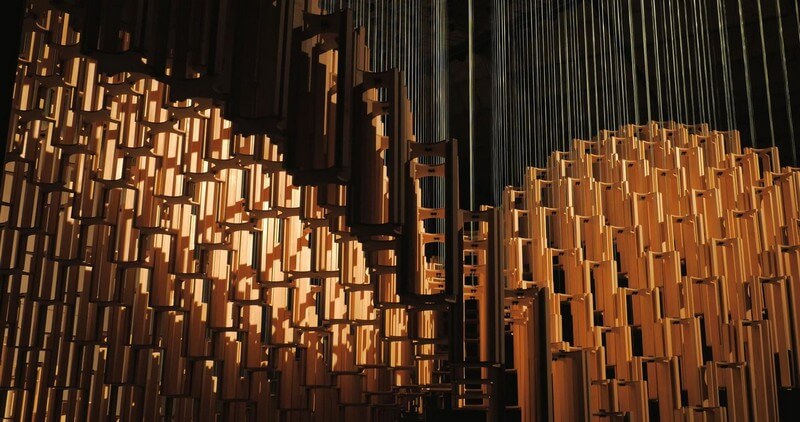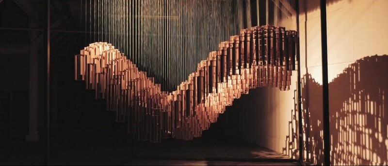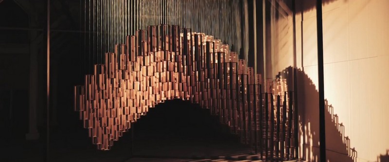Helio Curve is a kinetic sculpture by Reuben Margolin created for Hyundai Motor Company. It has two mechanical drives located 65 feet apart the ground. These produce continuously varying motion, which is translated through strings to the top of a 15 foot steel cube and then down to 400 wooden blocks.