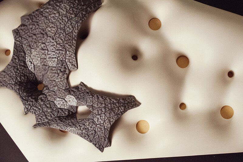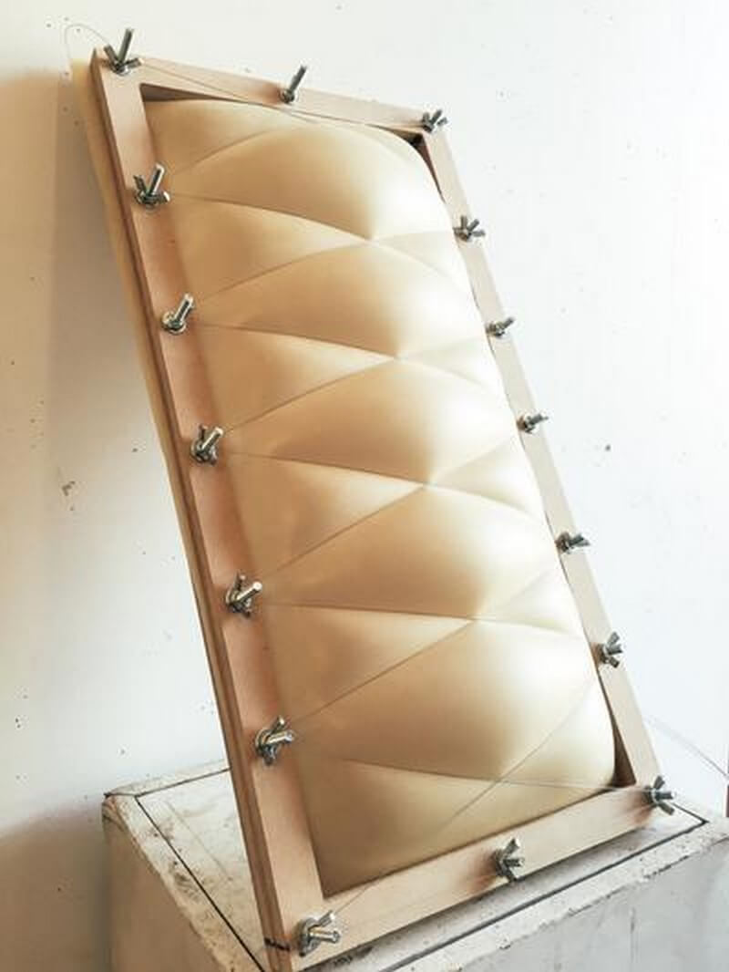 Utilizing a bottom up design approach, the project began with making physical models of pneumatic shells using latex clamped to mdf frames. The investigation continued by introducing various method to deform and shape the inflated forms.