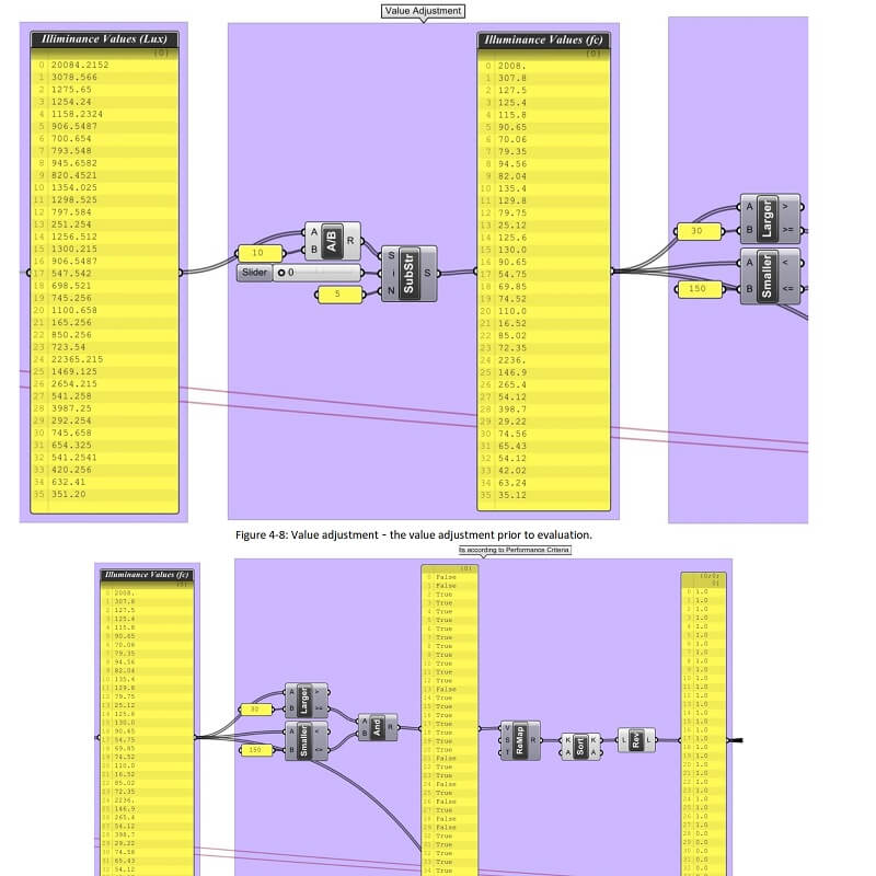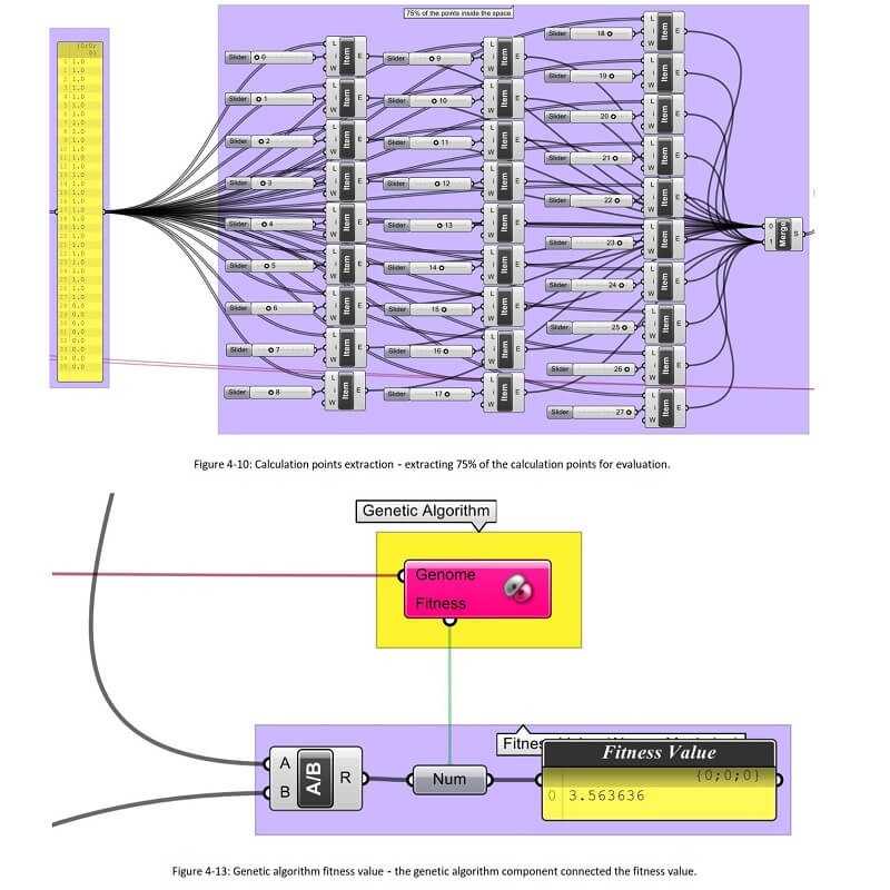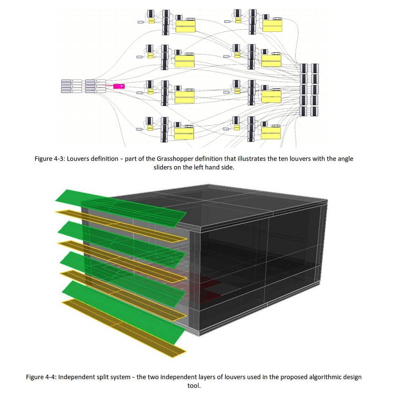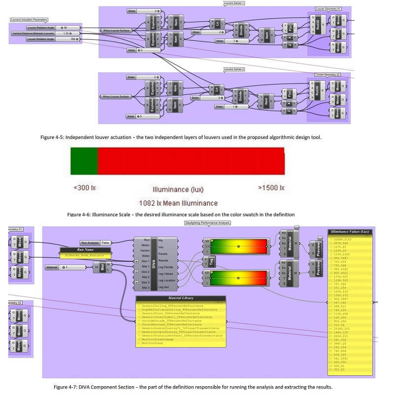 The main objective of the process and algorithm is to evaluate the performance of an intelligent façade, composed of a series of kinetic louvers that actuate in response to dynamic daylighting, and the incorporation of occupants’ preferences. Within the framework of this study, Grasshopper as a parametric computational tool allows the integration of Rhino, the design space, and DIVA, the dynamic daylighting tool, into a single process.