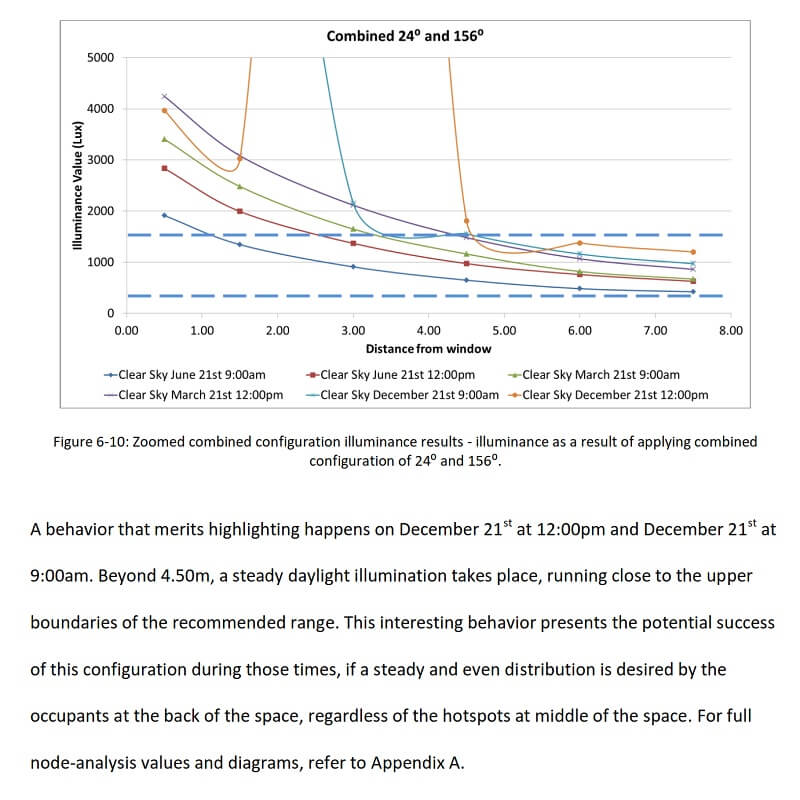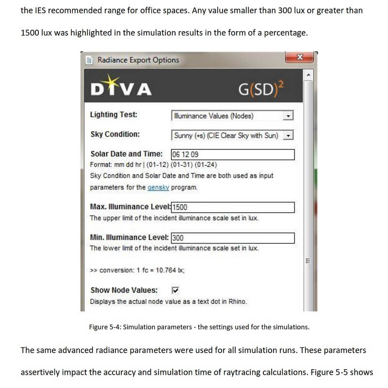 The parametric tool extracts the designed geometry from the modeling space and inputs it into the DIVA component to be tested for illumination performance, luminous distribution, and daylight penetration depth inside an office space.