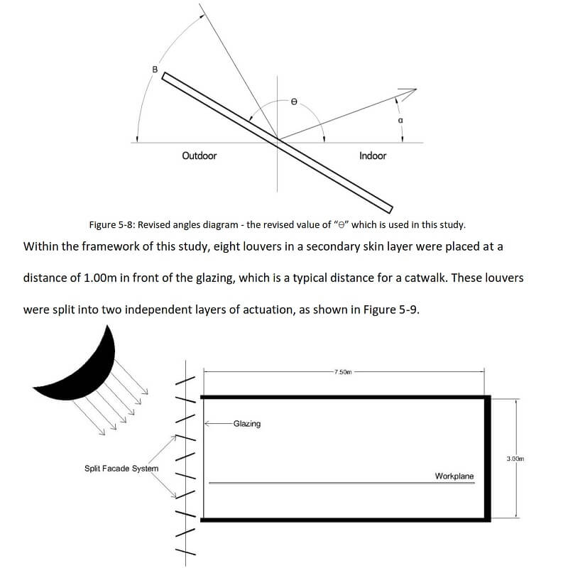 This thesis by Mohamed Mansour El Sheikh presents the initial experiment, in which the external skin actuates to optimize daylight-deflection, maintaining a desirable luminous indoor environment. In the experiment, the louvers rotate using the concept of independent tilt-angle, where every other louver has the same tilt angle; they could be in a harvesting, shading, or a combined configuration.