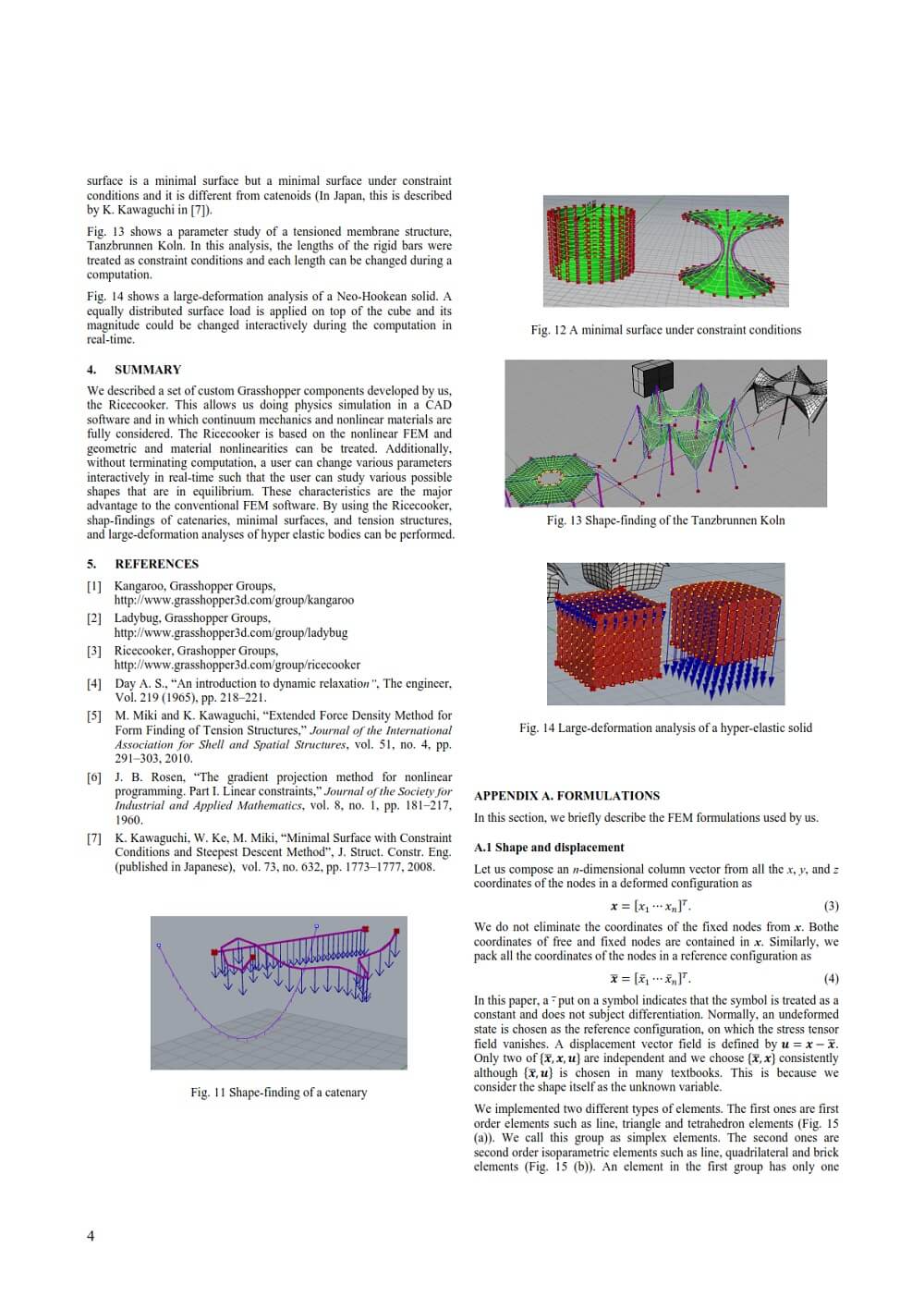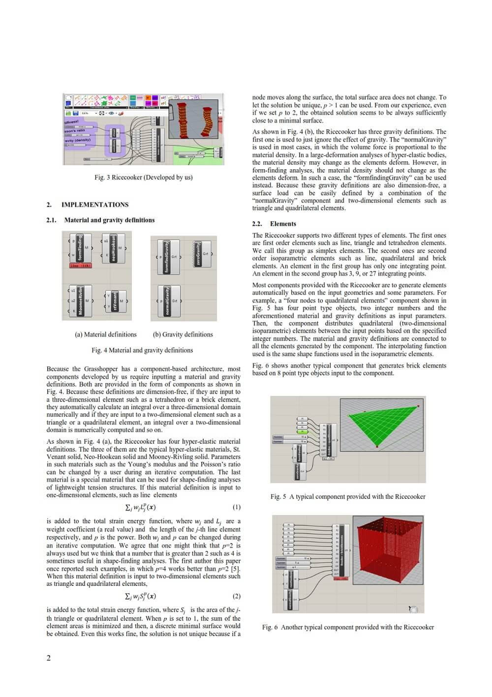 In this paper by Masaaki Miki, Jun Mitani and Takeo Igarashi, authors developed a set of Grasshopper components which enables interactive physics simulation based on the finite element method (FEM). They named this add-on Ricecooker. As a computational method, it is an explicit nonlinear FEM solver that can treat material and geometric nonlinearities. Unlike the usual FEM software, various parameters such as weight coefficients, material coefficients, and the coordinates of the fixed nodes can be changed during a computation through an interactive interface with real-time visualization. Some nonlinear constraint conditions can be also defined by using the provided components, and the constraint values such as the lengths of rigid bars can be also changed during a computation.