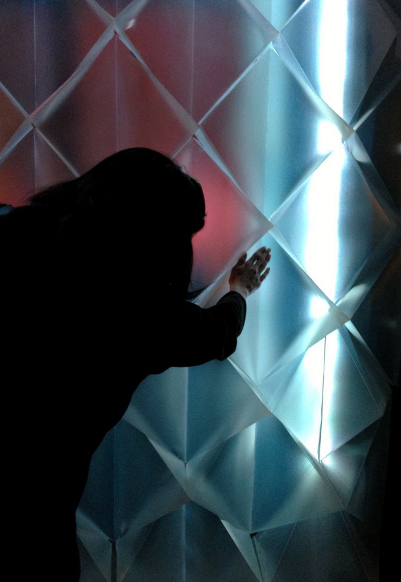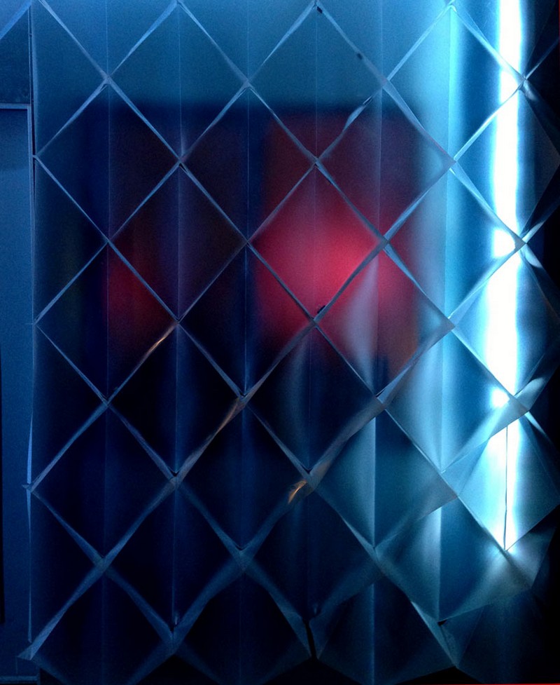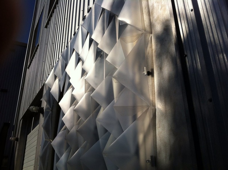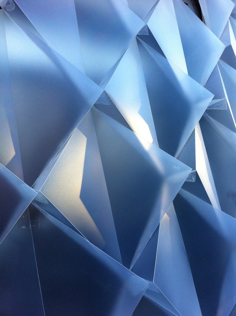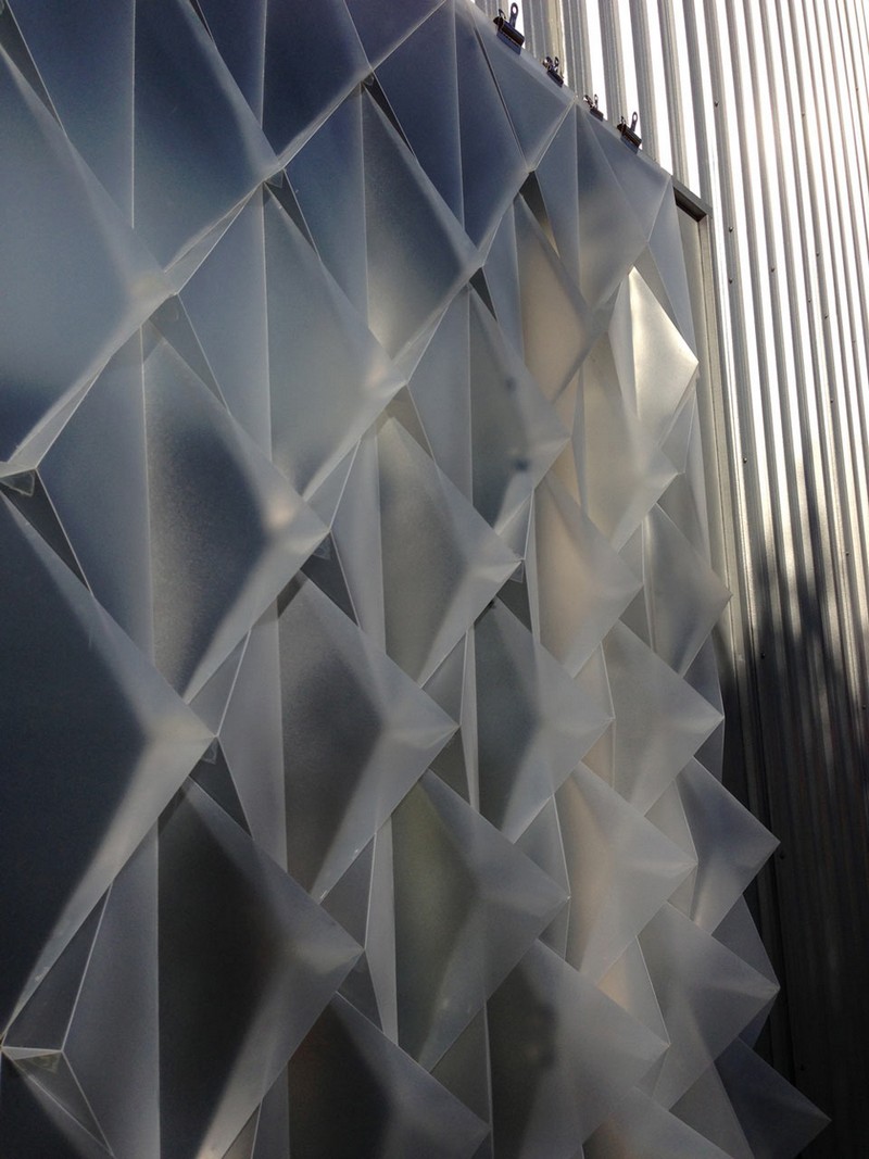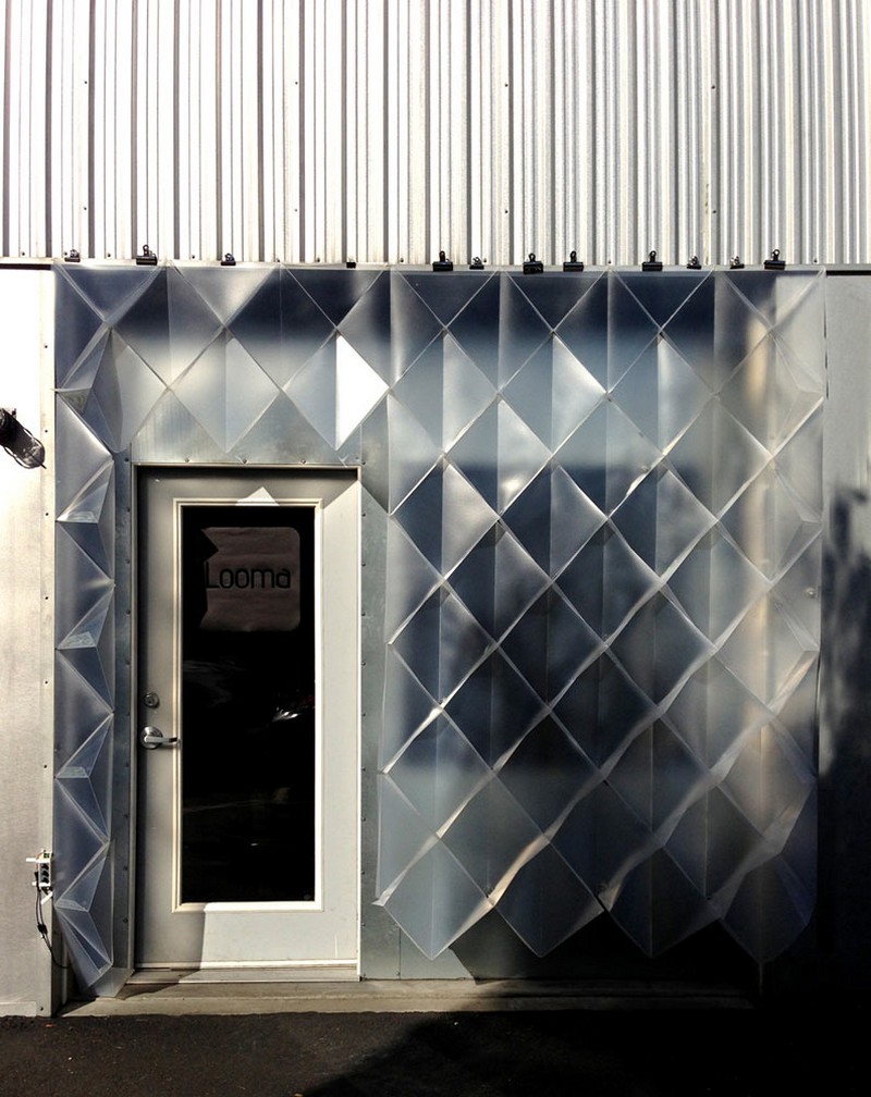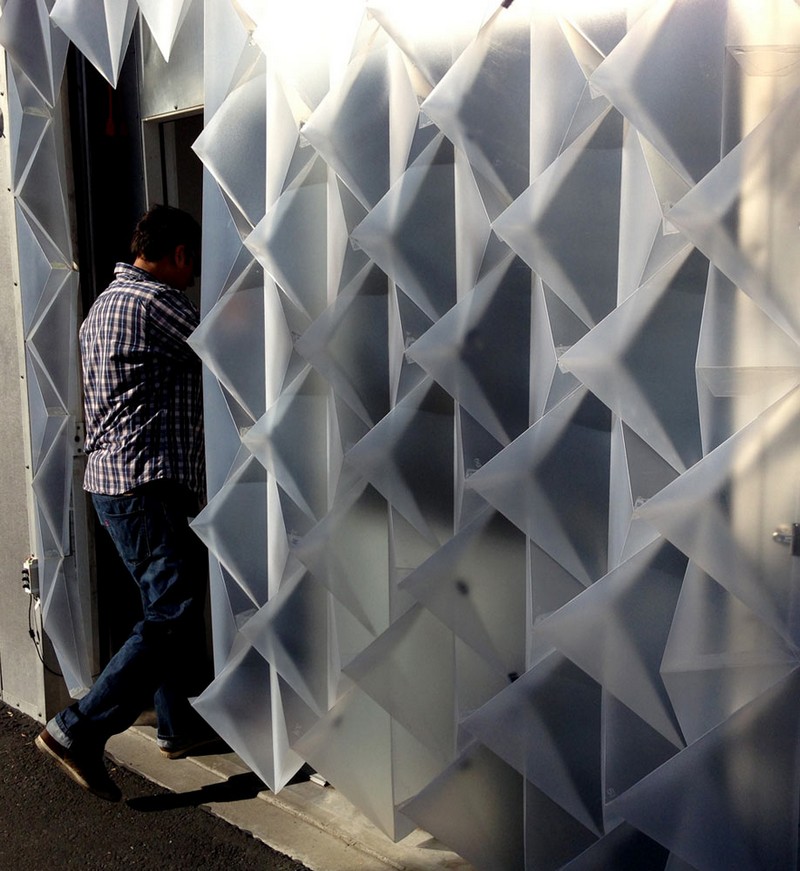 Custom designed, this temporary translucent skin was created as a portable façade for Berkeley-based, contemporary lighting studio Looma during an open studio event. Mahsa Vanaki worked with Looma designer Romy Randev to achieve the glowing, geometric surface that attached to the existing building and was easily removed and stored after the event.