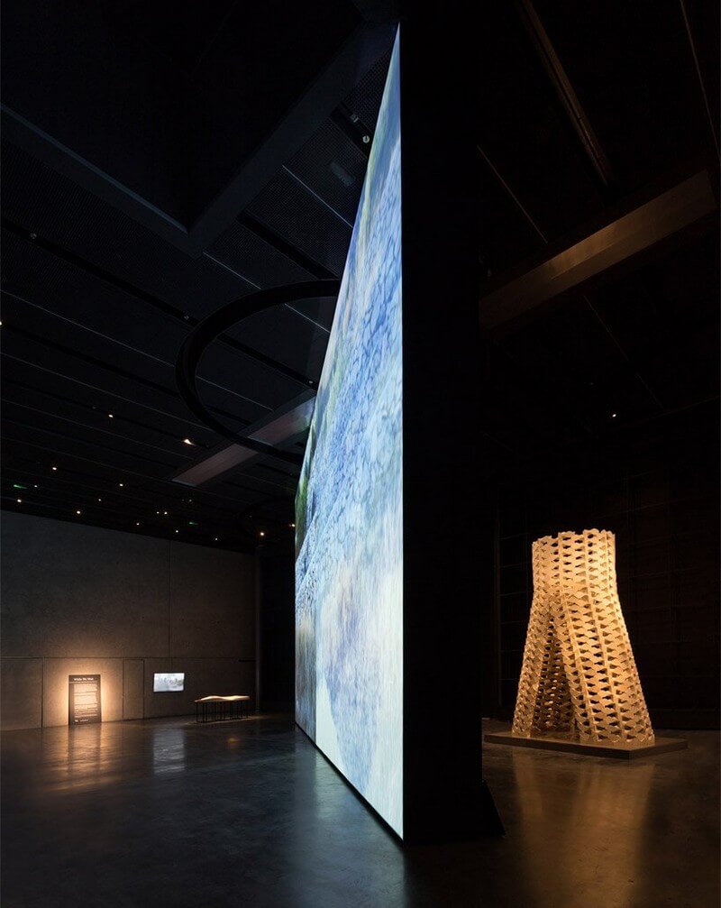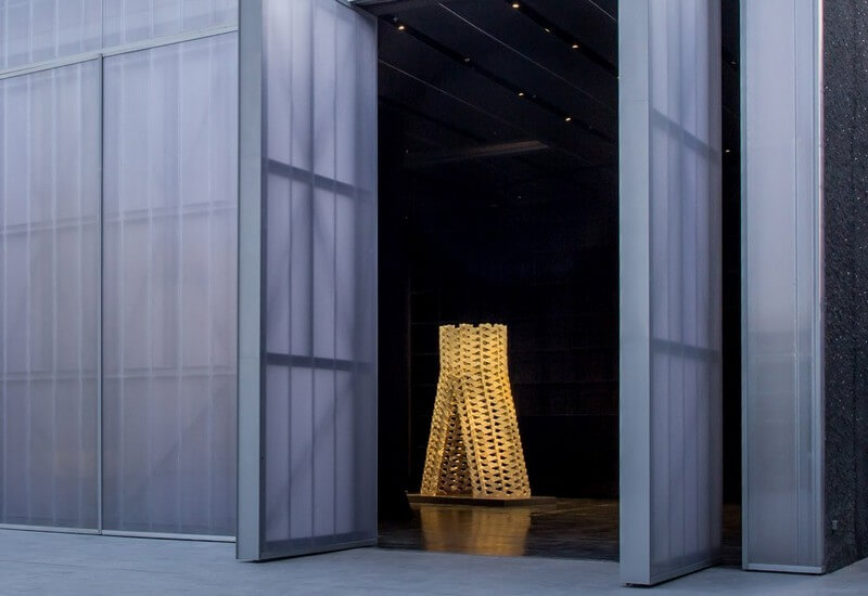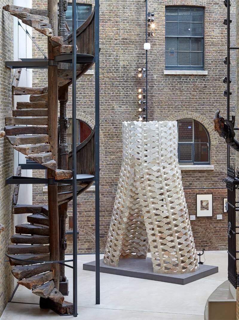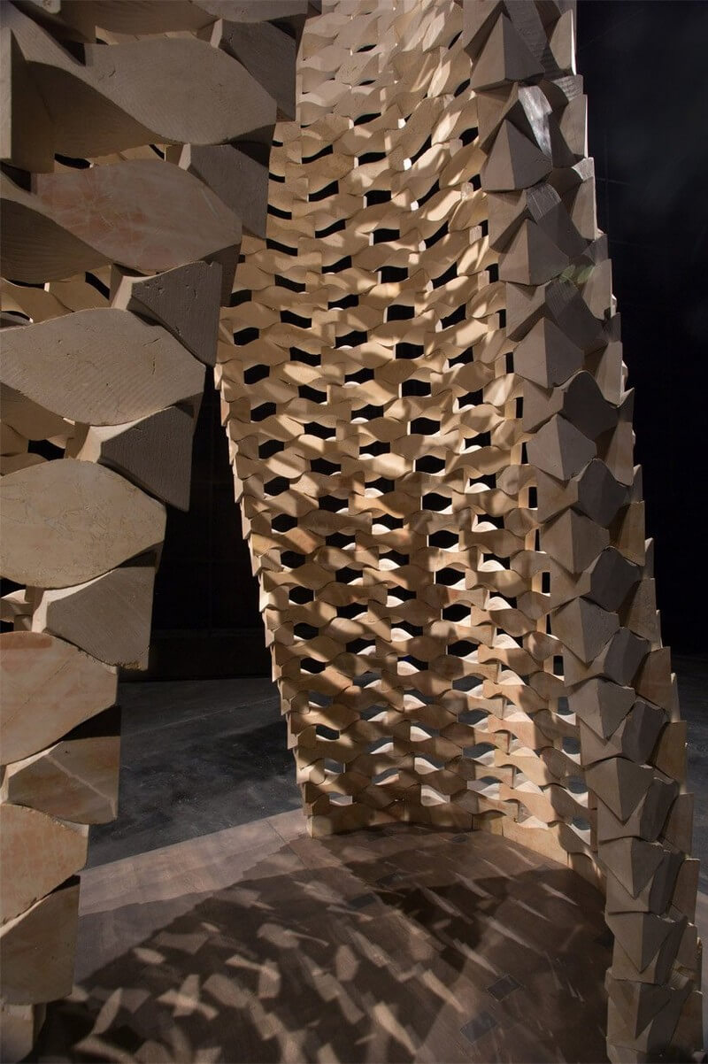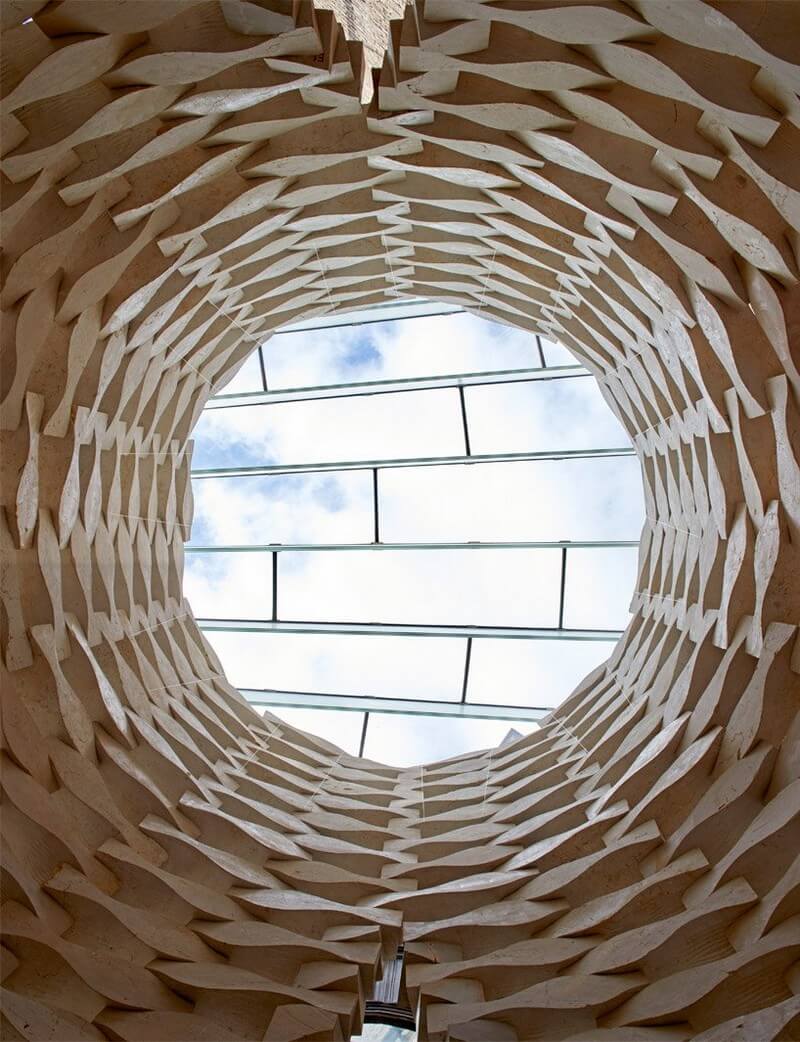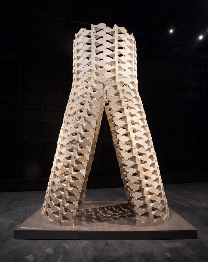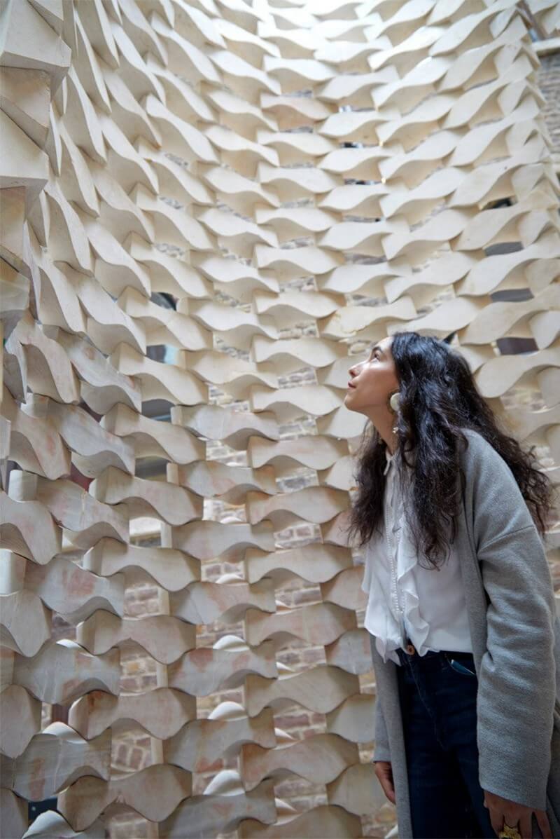 Palestinian architects and designers AAU ANASTAS’s ‘while we wait’ forms a sculptural installation comprising of differently colored pieces of stone quarried in various regions of their nation. Designed digitally, cut by robots and hand-finished by local artists, the material fits together to create a Y-shaped, lattice-like and visually porous tower, which fades in tones from an earthy red to pale limestone as it climbs higher.