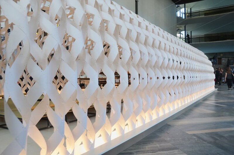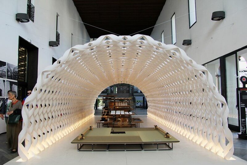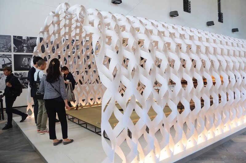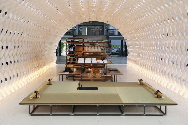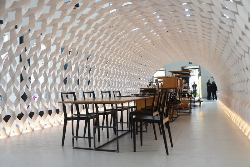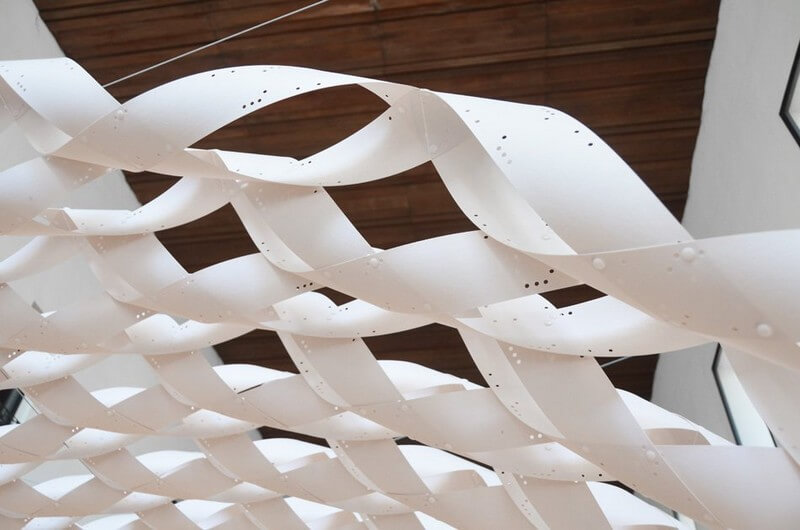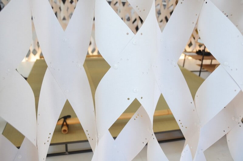 The pavilion, which is conceived as a ‘white cocoon’, has been constructed using 1 millimeter thick vulcanized paper that has been twisted and woven to form the arched structure. Internal components are composed of modular bamboo boards and steel pipes, which can be used to make a table, a bench or a shelving unit. Consequently, as the inhabitants life expands – so does the kitchen.