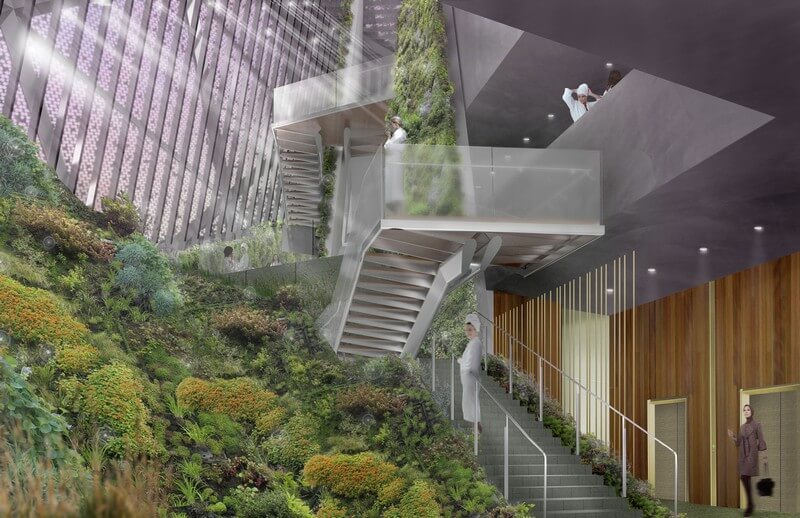 Each building will be wrapped in a perforated titanium rainscreen incorporating the kinetic Tessellate™ system to continuously adjust its opacity in response to changing environmental conditions. Alongside the architect, the Adaptive Building Initiative (a joint venture of Hoberman Associates and Buro Happold) is developing the custom façade that will control light levels in a choreographed guest experience.