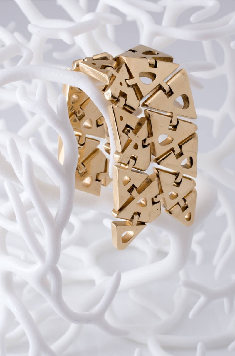 This Kinematics piece by Nervous System was 3d-printed using direct metal laser sintering (DMLS) in 18k gold by Cooksongold in collaboration with A3DM. This piece was fully articulated straight out of the printer and did not require any assembly.