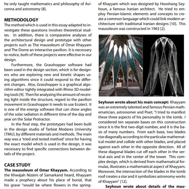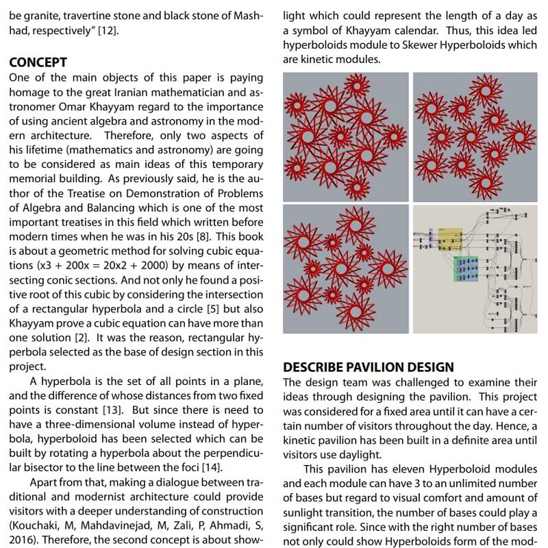 In this essay by Parinaz Mansourimajoumerd and Mohammadjavad Mahdavinejad, studies are about using kinetic design and fabrication method in one project despite ordinary ways regard to the two main points; 1. The impact of Khayyam’s mathematics and astronomy on the proposed kinetic architecture and 2. Creating interaction Between Indigenous ideas and Contemporary Architecture in Khayyam Memorial Pavilion.