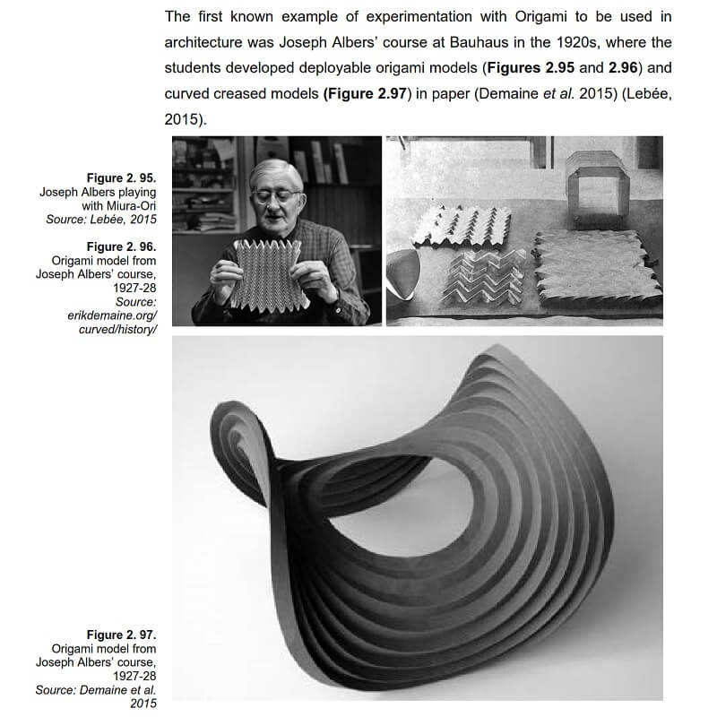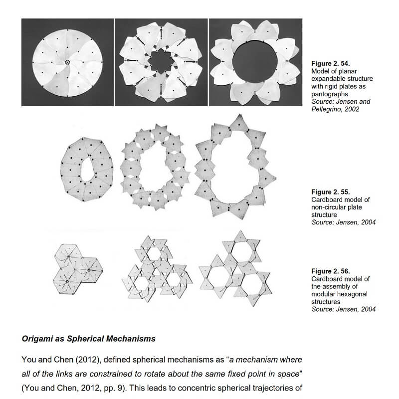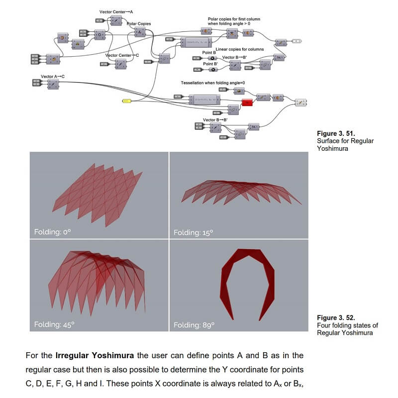 This specific kind of tessellated surfaces are the result of the transformation of a flat element, without any special structural skill, into a self-supporting element through folds in the material, which gives them the aptitude to undertake various configurations depending on the crease pattern design and welldefined rules for folding according to rigid kinematics.