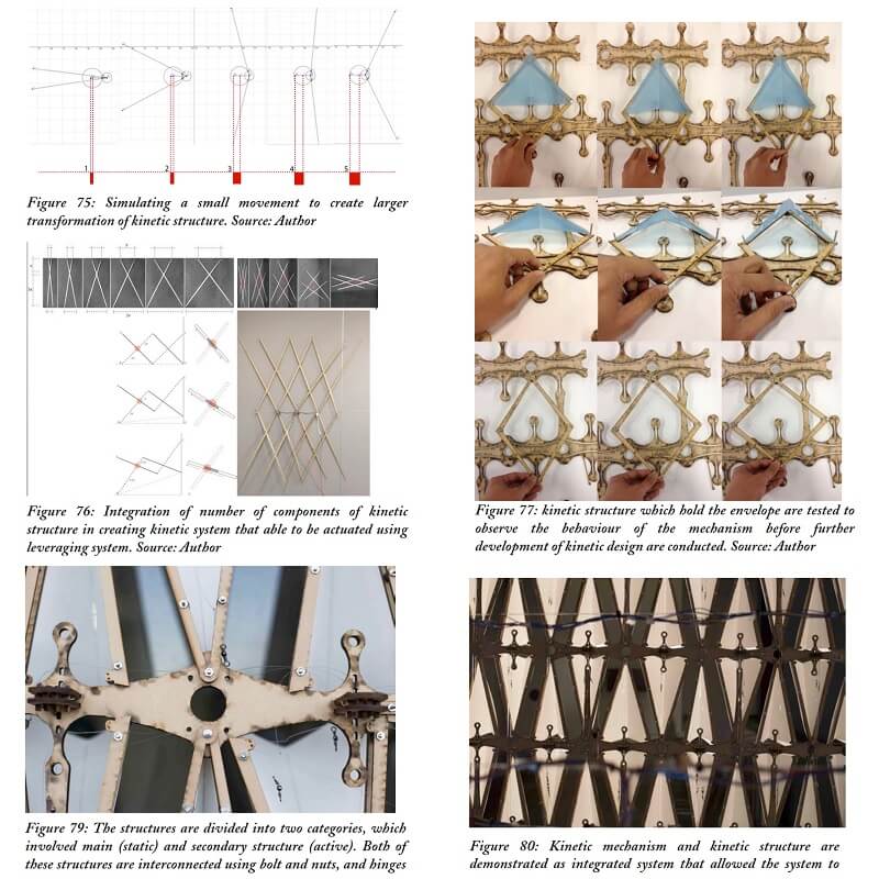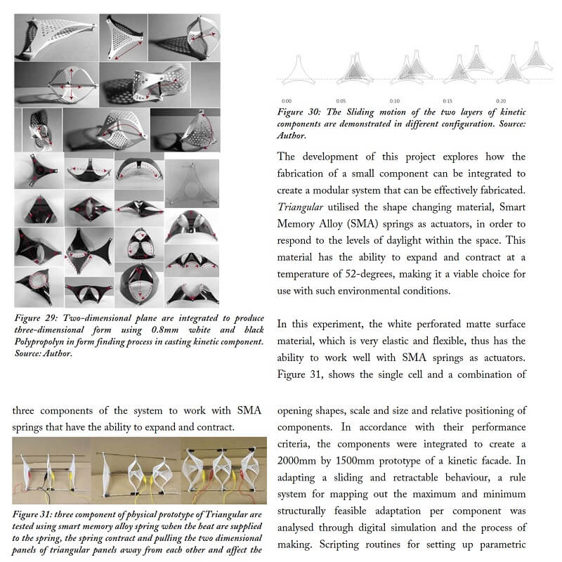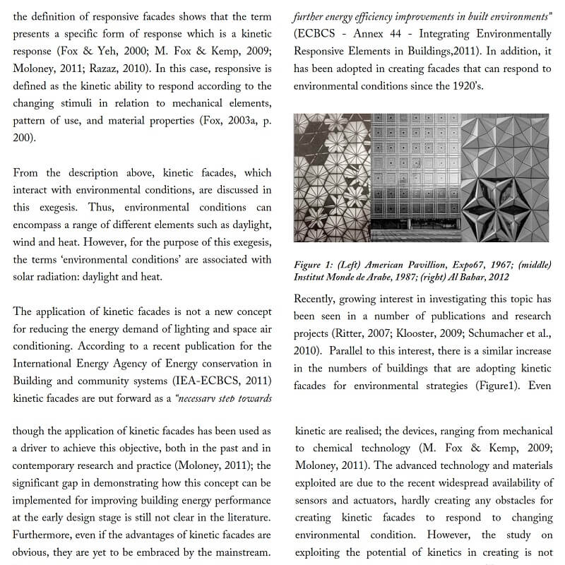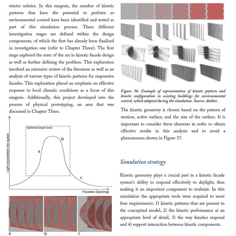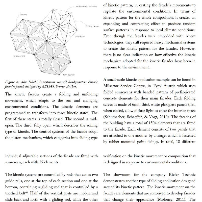 In this research by Kamil Sharaidin, kinetic facades are defined as the ability to response and adapt to the changes of the environmental conditions. The strategies mainly focus on the functions and performances of kinetic facades in the context of indoor daylight quality and thermal heat performance. These are achieved by examining the role of kinetic elements on the building facades to form effective kinetic configurations in response to environmental changes.