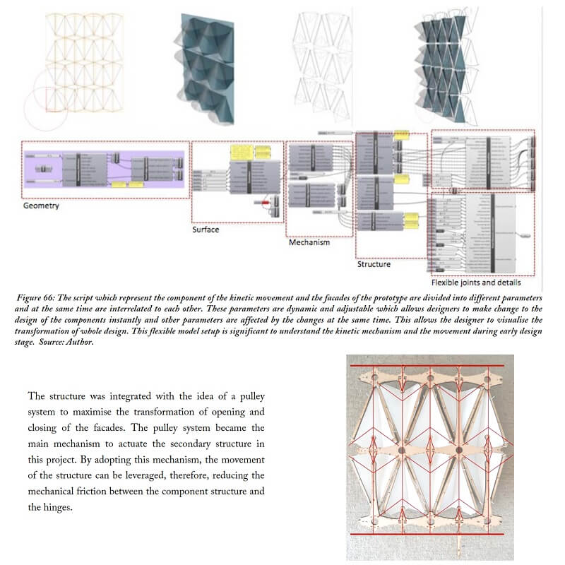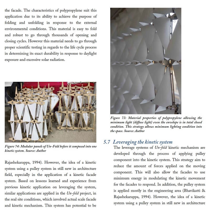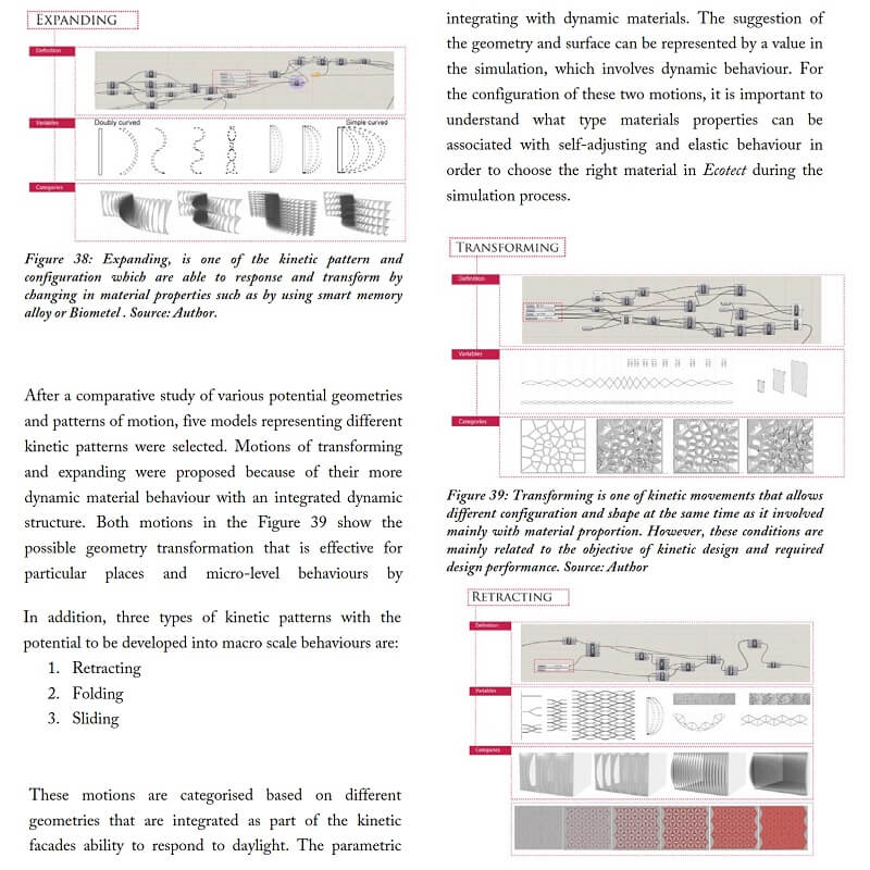 In this research by Kamil Sharaidin, kinetic facades are defined as the ability to response and adapt to the changes of the environmental conditions. The strategies mainly focus on the functions and performances of kinetic facades in the context of indoor daylight quality and thermal heat performance. These are achieved by examining the role of kinetic elements on the building facades to form effective kinetic configurations in response to environmental changes.