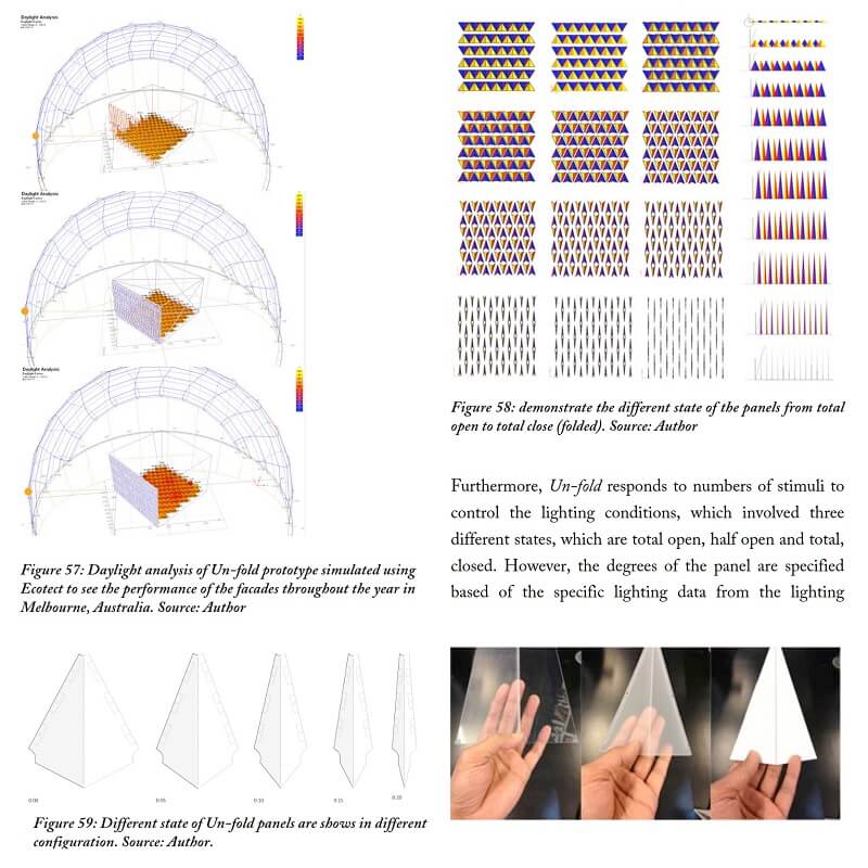 These evaluations are aimed to achieve an optimum automated facade configuration, which specifically enable design exploration of semi autonomous or fully autonomous configurations of a kinetic facade system. The process of evaluating the performance of kinetic design via digital simulations and physical testings allows designers to overcome the limitations of the existing analytical and digital simulation tools.