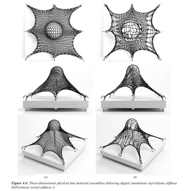 A key contribution of this research is the development of a framework to help designers better understand how the topology of a knit structure can align with formal and structural motivations of tension activated architectural forms. This was accomplished through the identification of the knit pattern as code.