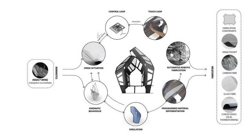 The project was designed and realized by students and researchers, supported by a multi-disciplinary team of architects, engineers, biologists, and paleontologists. inspired by the folding wing mechanisms of the coleoptera coccinellidae — otherwise known as the ladybird (UK), or ladybug (US) — the team sought to investigate large-scale compliant architecture.