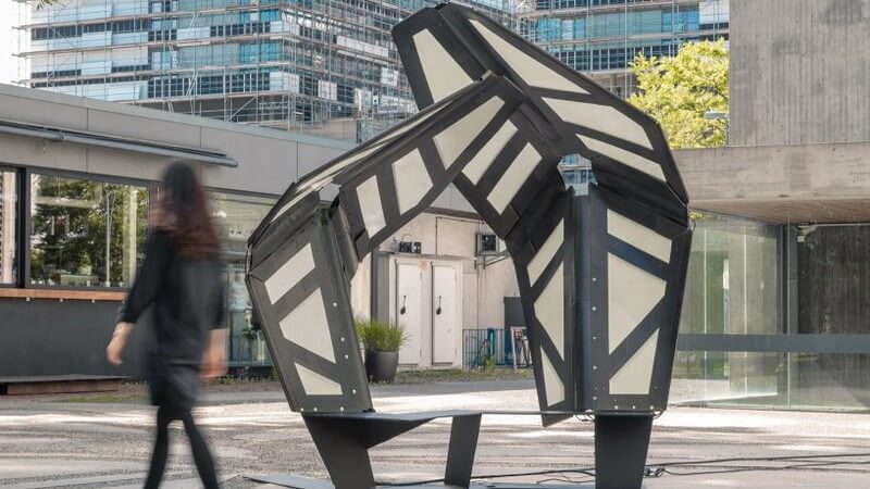 Utilizing the elastic deformation of distinct flexible hinge zones to enable spatial reconfiguration, the demonstrator explores the potential of utilizing fiber-reinforced plastic materials in large-scale kinetic folding systems. thanks to an interactive control system — consisting of integrated sensors, online communication, and backend computational processing — the wings can be moved either by a physical touch or remotely via a connected device.
