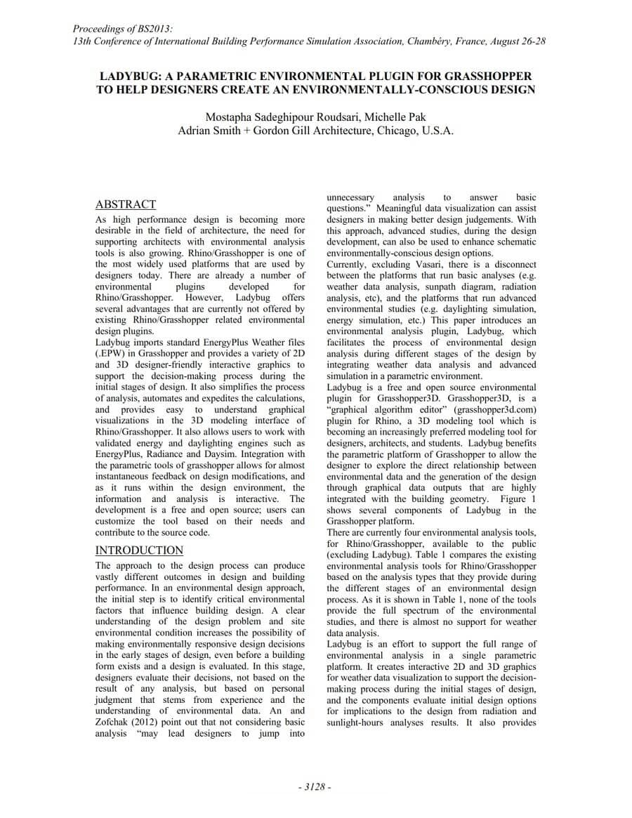 This article by Mostapha Sadeghipour Roudsari, Michelle Pak, Adrian Smith and Gordon Gill Architecture is about Ladybug: A Parametric environmental plugin for grasshopper. As high performance design is becoming more desirable in the field of architecture, the need for supporting architects with environmental analysis tools is also growing. Rhino/Grasshopper is one of the most widely used platforms that are used by designers today. There are already a number of environmental plugins developed for Rhino/Grasshopper. However, Ladybug offers several advantages that are currently not offered by existing Rhino/Grasshopper related environmental design plugins.