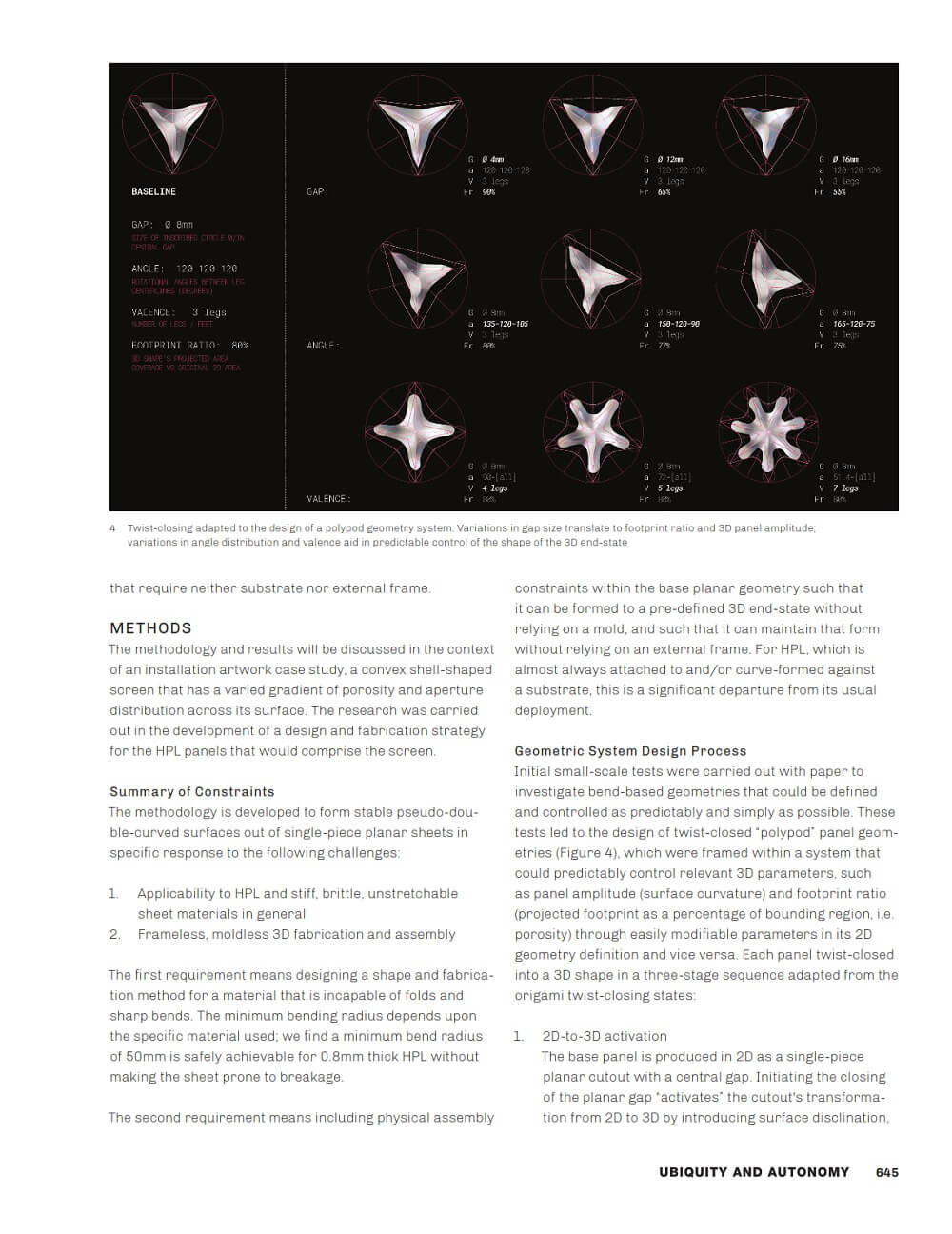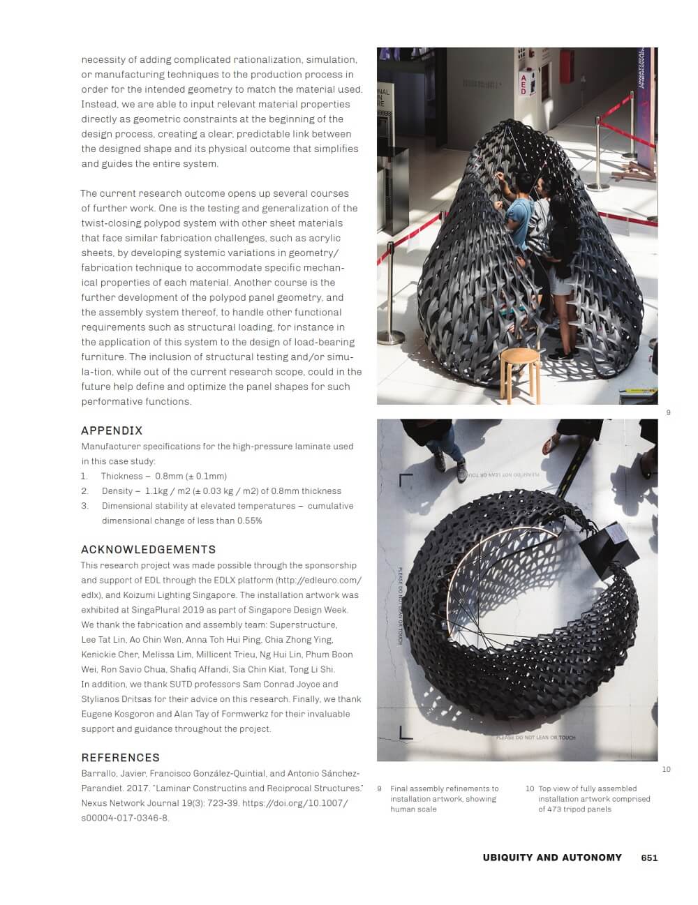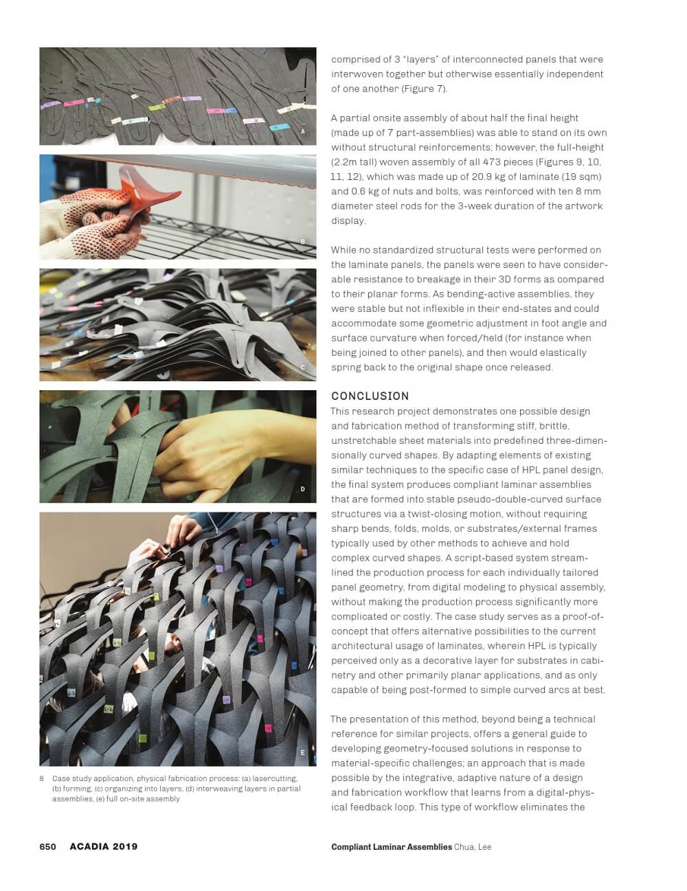 These are reflected in a workflow that integrates digital form-generation and fabrication-rationalization techniques to reference and apply these principles at every stage. Significant capabilities of the developed methodology include: (1) achievement of pseudo-double-curvature with brittle, stiff sheet materials; (2) stabilization in a 3D end-state as a frameless self-contained single-element laminar reciprocal structure—essentially a compliant mechanism; and (3) an ability to pre-encode 3D assembly constraints in a 2D cutout pattern, which guides a moldless fabrication process. The paper reviews the precedent geometric techniques and principles that comprise this method of 3D surface fabrication and describes a sample deployment of the method as applied to the design of laminar modules made of high-pressure laminate (HPL).
