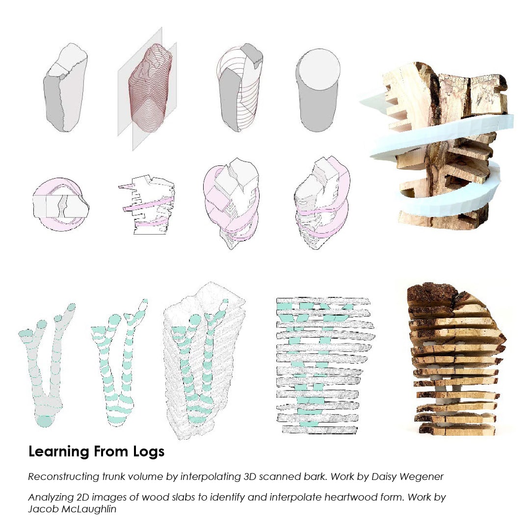 Irregular material, harvested from fallen trees on campus, functions as a complex generator containing information on form, age, structure, texture, and more.