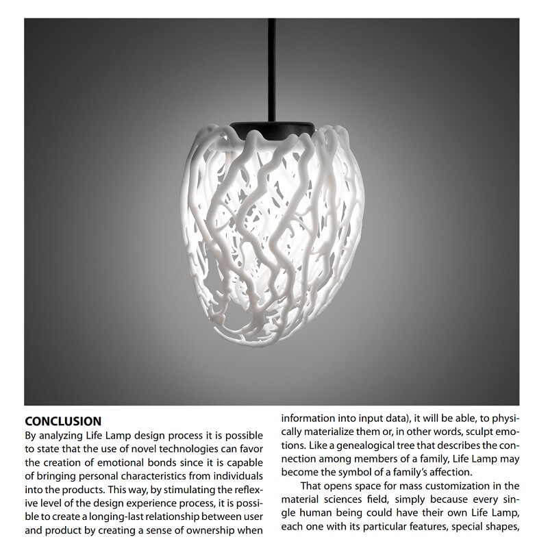 Nowadays it is possible to use technology to achieve emotion-oriented products related to the user experience. The aim of this paper by Daniel Nunes Locatelli, Leonardo Prazeres Veloso de Souza, Guilherme Giantini, Vitor Curti and Carlos Augusto Joly Requena, is to address a design exploration that combines the use of algorithmic modeling in order to create a design that seeks to express meaning through emotional bonds with people.