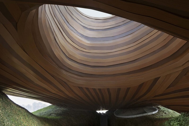 Liyang Museum is located in the southeast corner of Yan Lake Park in the new urban district, connecting an urban public space to the new nature. The organic lines and undulating mountains compose melodious music in the mountain forest. An Open Attitude welcomes people from all directions. The perfect combination of terrain tells about landscape culture and creates an oriental poetic life.