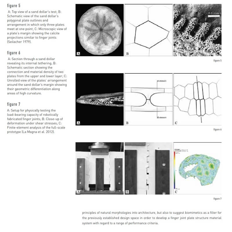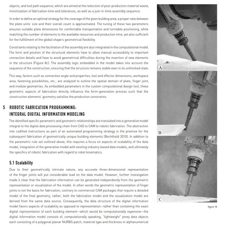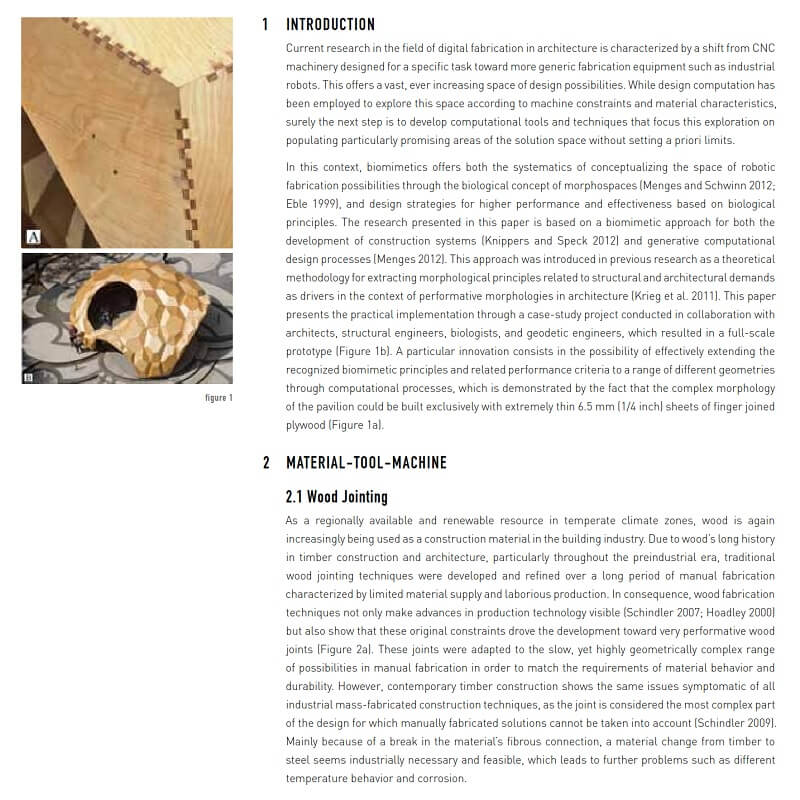In the first part, the use of an industrial robot’s design space for developing differentiated finger joint connections for planar sheets of plywood is introduced. Subsequently, biomimetics is proposed as a filter for the possible geometric differentiations with respect to performative capacities.