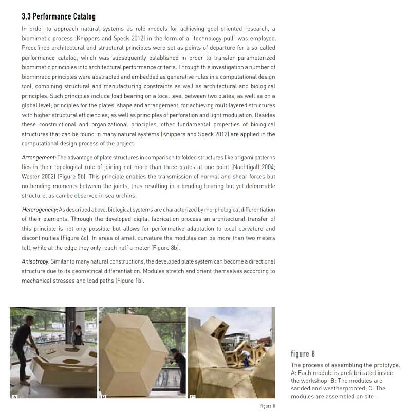 The second part focuses on the integration of fabricational and biomimetic principles with structural and architectural demands, as well as the development of a custom digital data structure for the fabrication of finger joint plate structures resulting in the construction of a full-scale prototype.
