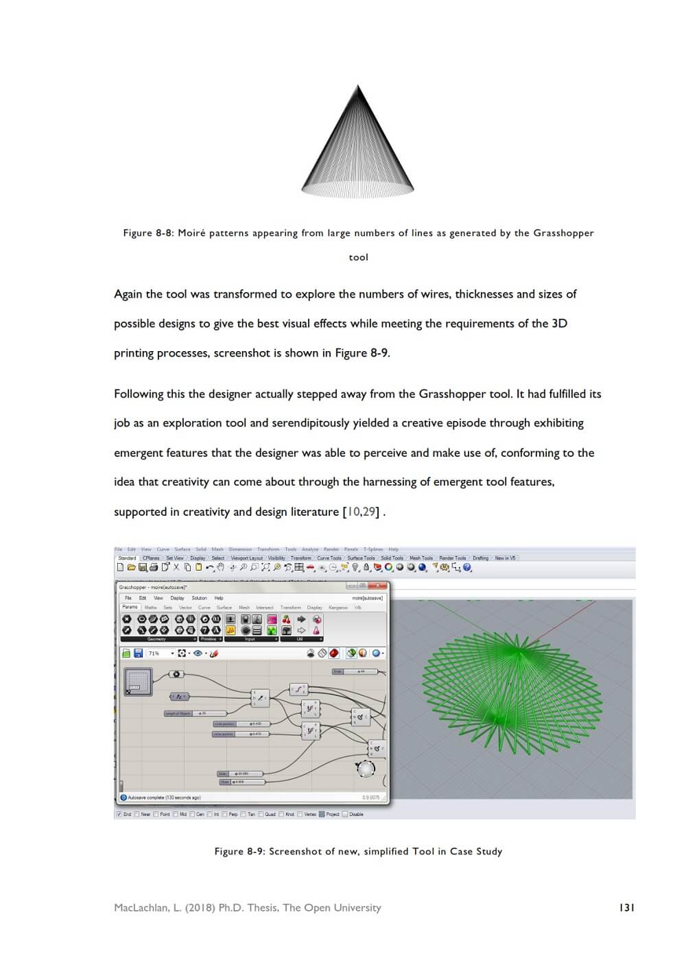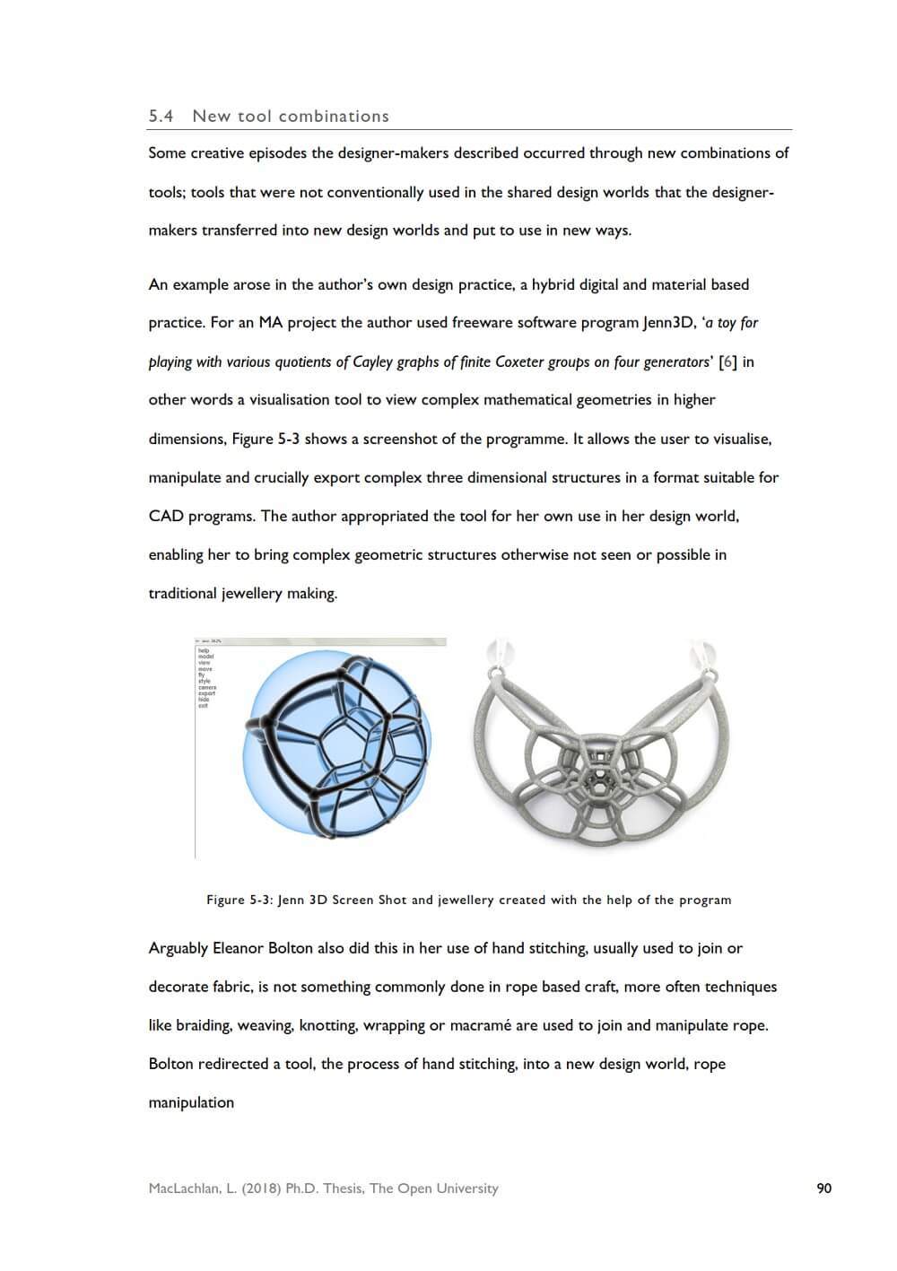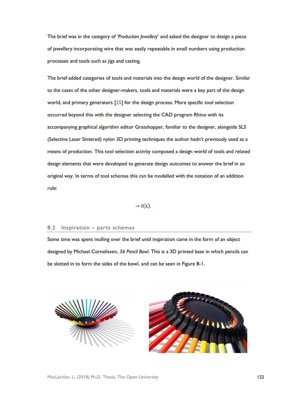 The first part of the thesis by Lynne Maclachlan examines shape grammar theory as a method of modelling designer-maker creative episodes, to inform designer practice. Evidence was gathered from interviews with designer-makers, observations from a design process carried out by the author and other literature on designer-makers. This evidence was analysed in the context of shape grammar and established creativity literature in order to seek formal descriptions of creative episodes. It was found that designer-makers used tools to define personal and shared design worlds and focused on and undertook specific activities relating to tools which have been classified; tool selection, tool combination and tool transformation, all of which have creative potential.