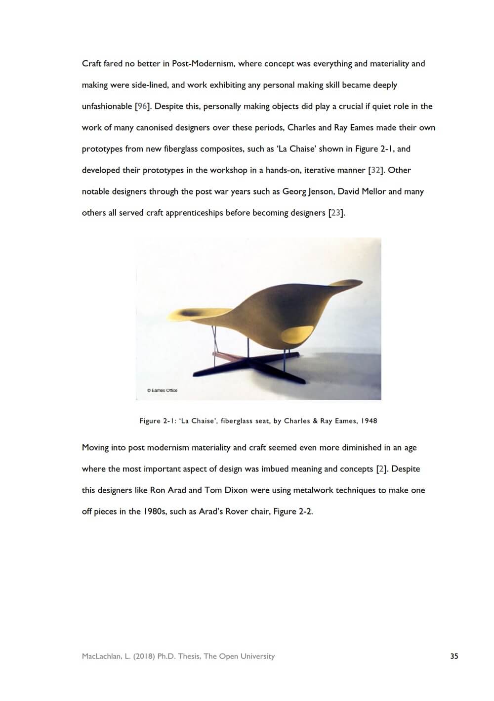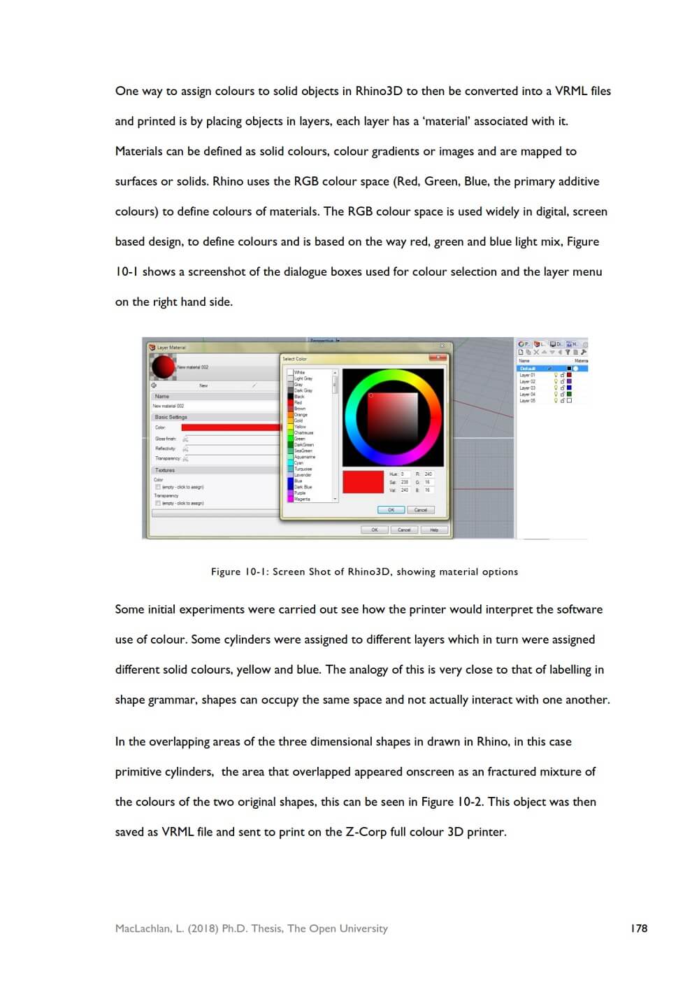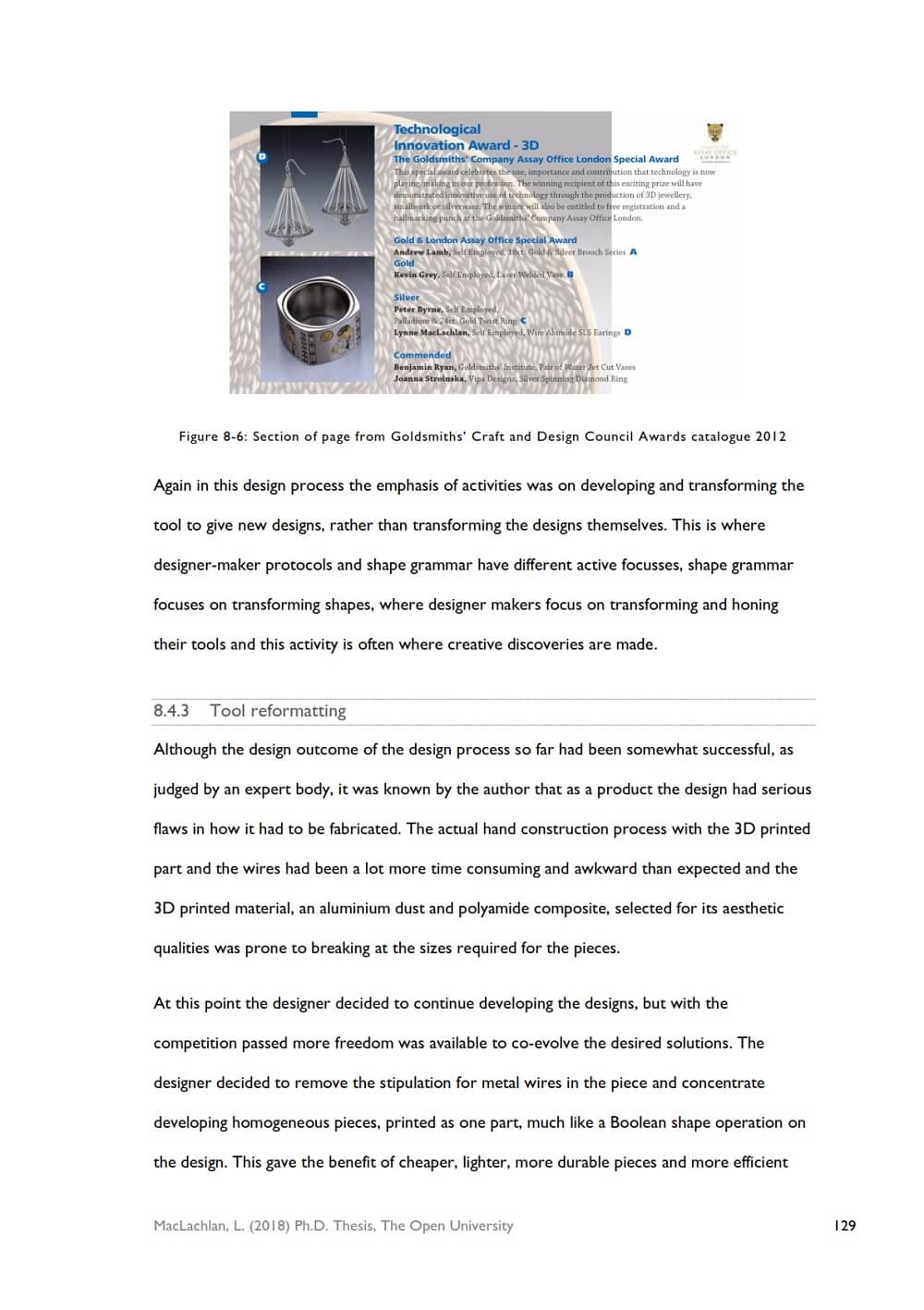 The first part of the thesis by Lynne Maclachlan examines shape grammar theory as a method of modelling designer-maker creative episodes, to inform designer practice. Evidence was gathered from interviews with designer-makers, observations from a design process carried out by the author and other literature on designer-makers. This evidence was analysed in the context of shape grammar and established creativity literature in order to seek formal descriptions of creative episodes. It was found that designer-makers used tools to define personal and shared design worlds and focused on and undertook specific activities relating to tools which have been classified; tool selection, tool combination and tool transformation, all of which have creative potential.