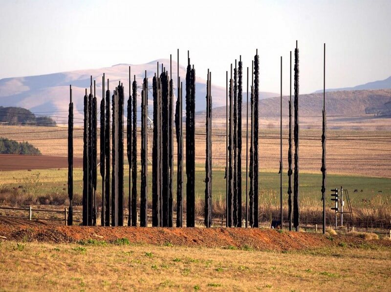 The 50 columns represent the 50 years since Mandela’s capture, as well as solidarity. Becoming part of the surrounding landscape, the art object is affected by the changing light and atmosphere behind and around it.