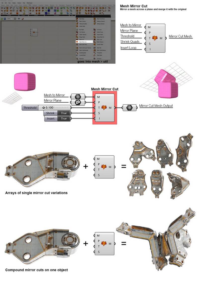 It is really handy to run in a loop with Anemone for generating many variations of a geometry, essentially creating a sort of library of parts. Also, by compounding multiple iterations of mirror cut onto one geometry you quickly get some complex shapes emerging from simple ones. The component works with opened and closed meshes. Will appear in the Mesh > Util tab.