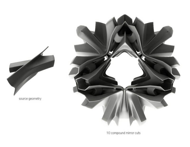Mesh Mirror Cut a plugin by Michael Pryor which now is a part of Pufferfish, is inspired by Autodesk Maya’s Mirror Cut tool, which is great for creating symmetry. Mirror cut trims a mesh at a plane then mirrors it over the plane and stitches the original + mirrored meshes together into one new clean mesh.