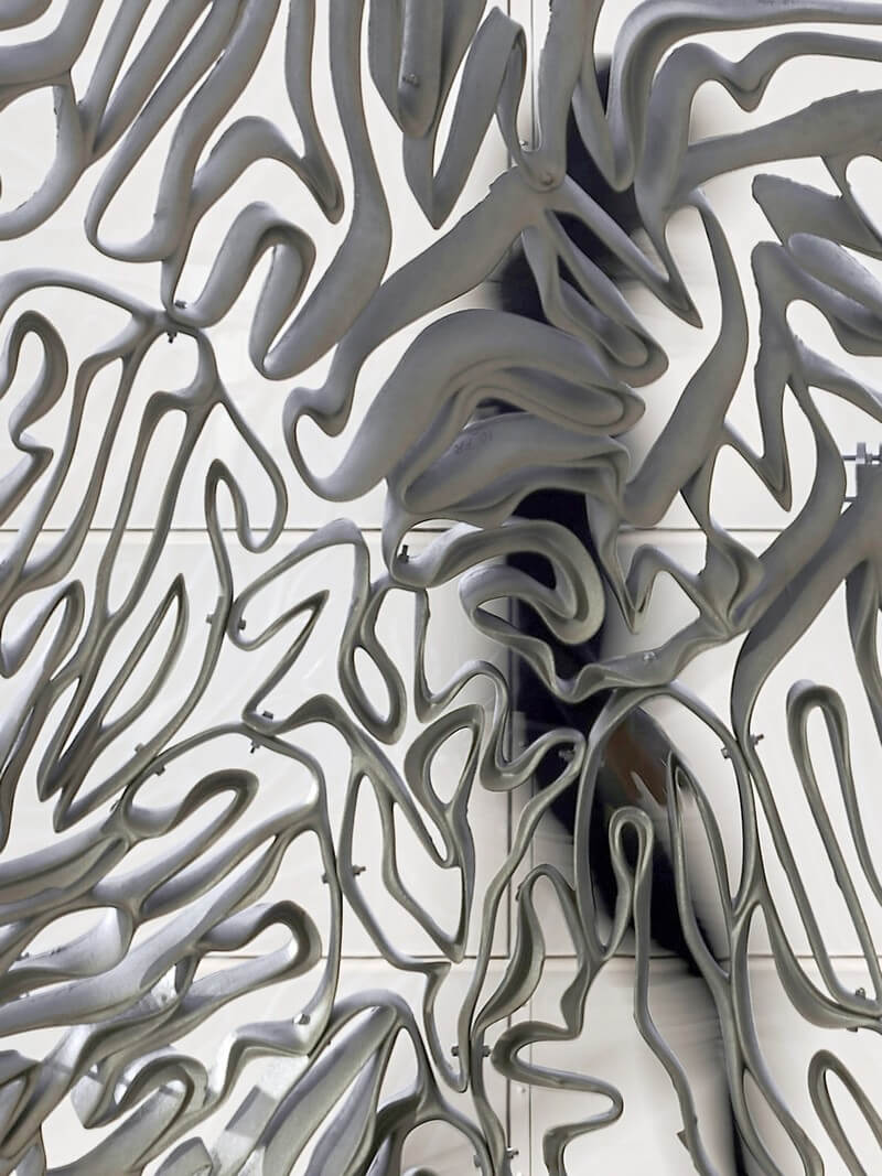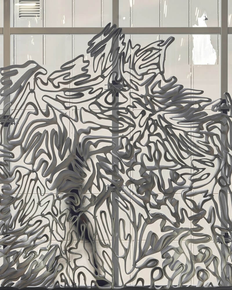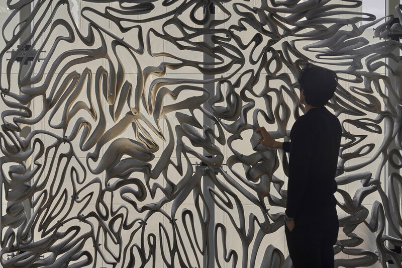 The Deep Facade is made of 26 articulated panels, combined into a structure that’s six metres high and four metres wide. Its ornamental design is produced by a differential growth algorithm, meaning it mimics the development of certain living organisms.