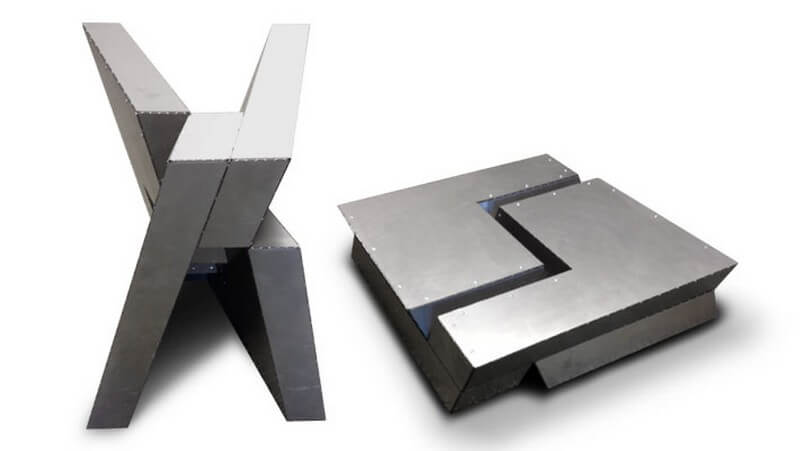 Metal origami by studiodror utilizes the Industrial Origami folding technology to form solid QuaDror blocks out of metal sheets. This piece manifests QuaDror strength and efficiency with the use of a single sheet of light material folded into singular, high load-bearing assemblies, significantly reducing welding and fastening needs.