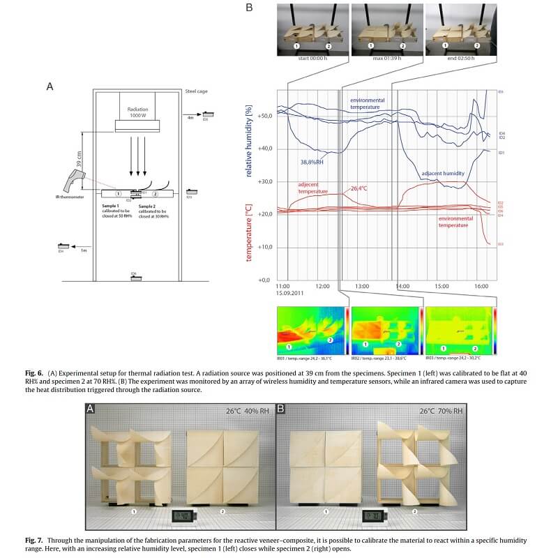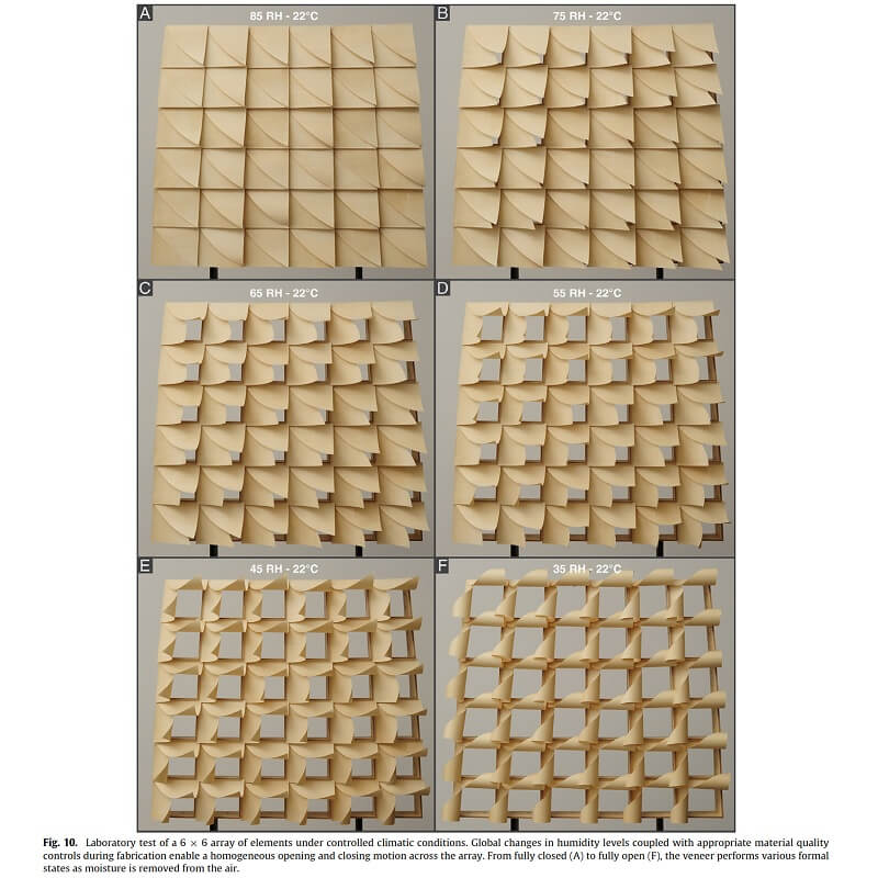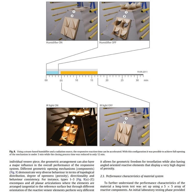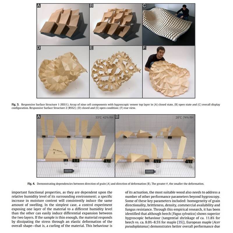 It provides a summary of five years of research by the authors on architectural systems which utilize the hygroscopic qualities of wooden veneer as a naturally produced constituent within weather responsive composite systems, which is presented through an extensive analysis of research samples, prototypes at various scales, and two comprehensive case studies of full scale constructions.
