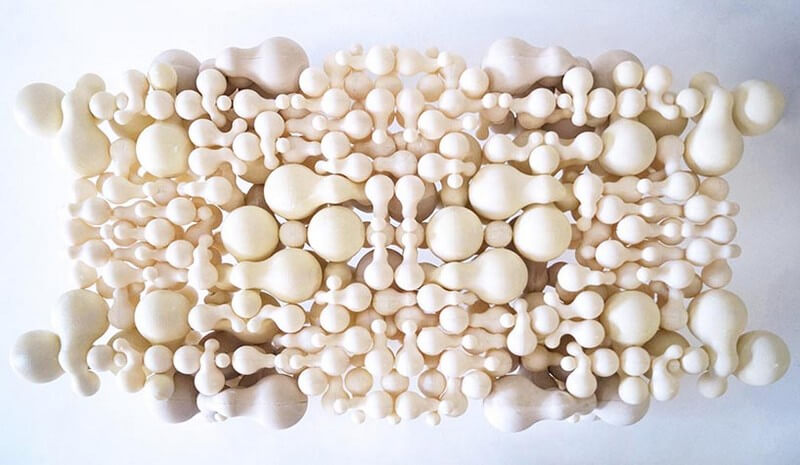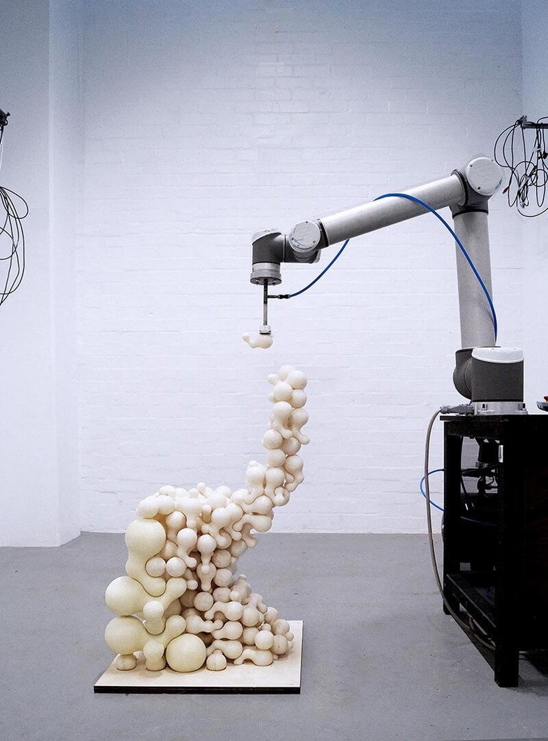The elements are designed in two parts, with a joint connection. this allows to make the elements hollow and lightweight. using a custom-made vacuum gripper attached to the industrial robotic arm, the building blocks can be picked up by the robot and assembled with a simple, rapid pick and place mechanism. the spherical geometry reduces the need for high-tolerance and precision in the assembly.